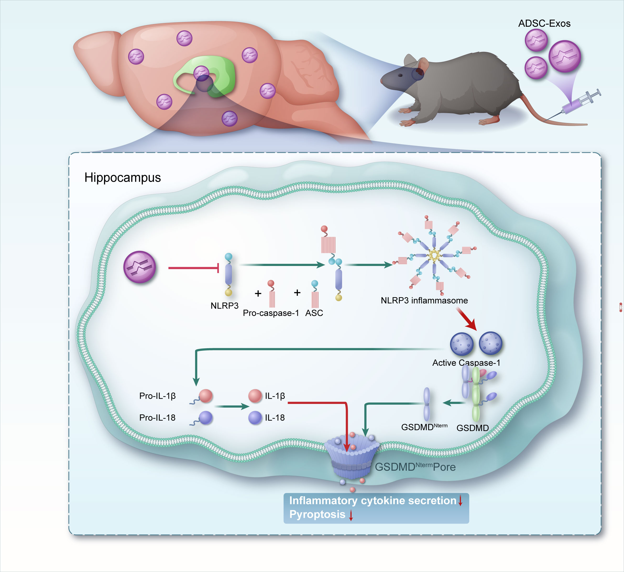 Illustration showing the effect of ADSC-Exos on the hippocampus. A mouse is injected with ADSC-Exos. In the hippocampus, ADSC-Exos inhibit the NLRP3 inflammasome formation, reducing active Caspase-1 and inflammatory cytokines IL-1β and IL-18. This process decreases inflammatory cytokine secretion and pyroptosis, depicting a protective mechanism against inflammation.