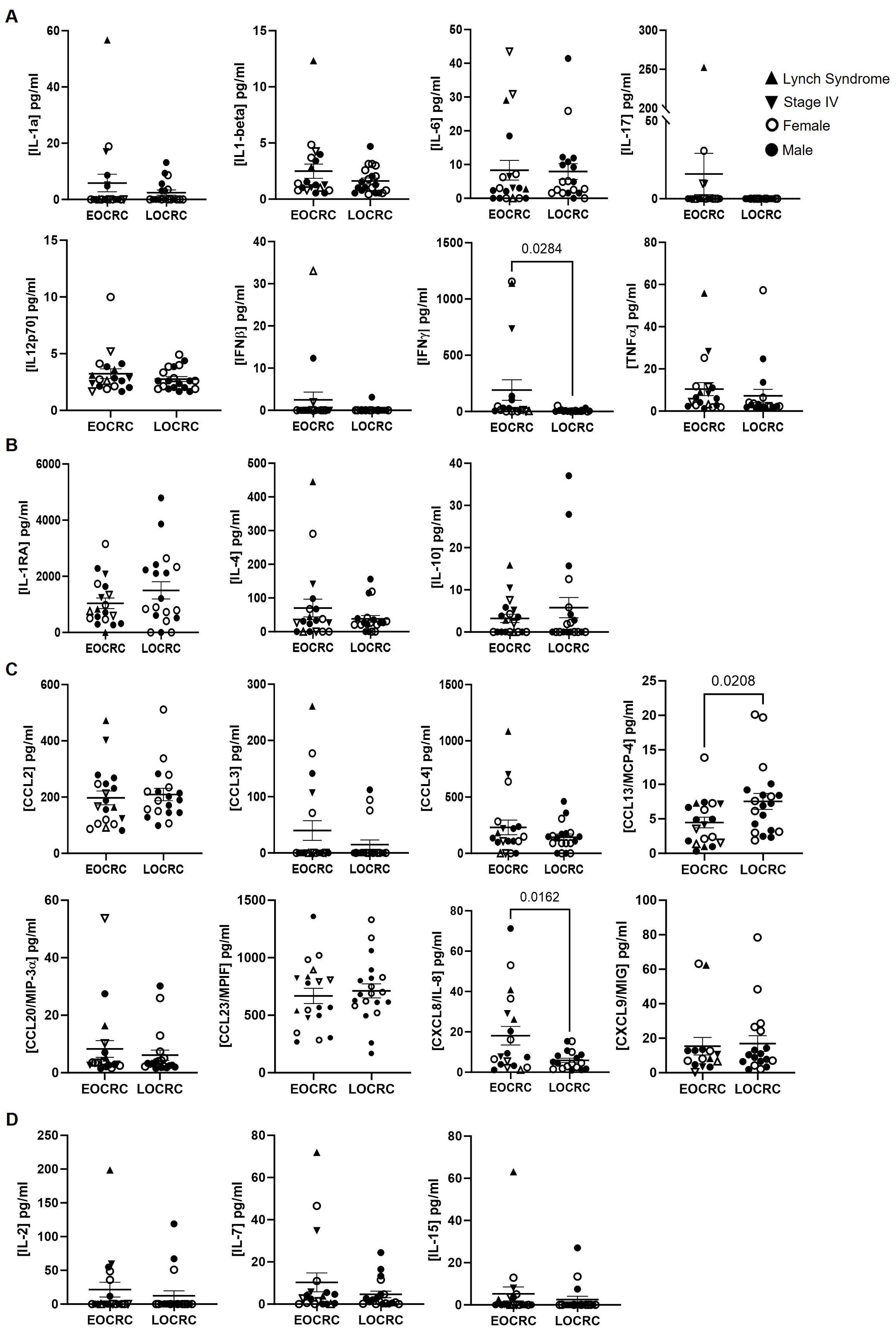 This observational study recruited two cohorts of participants with CRC stratified by age (n=38). Sociodemographic and clinical descriptions of the participants are summarized in Table 1 and described in more detail in Supplementary Table 1. The EOCRC cohort had a median age of 44 years (IQR 41-48), while the LOCRC cohort had a median age of 76 years (IQR 55-84). Over half of the participants in both cohorts were men (63.2% in EOCRC and 52.6% in LOCRC). In all analyses, samples from men and women were identified separately to determine whether sex-related differences may exist in any of the assessed parameters with potential influence on the development of CRC.