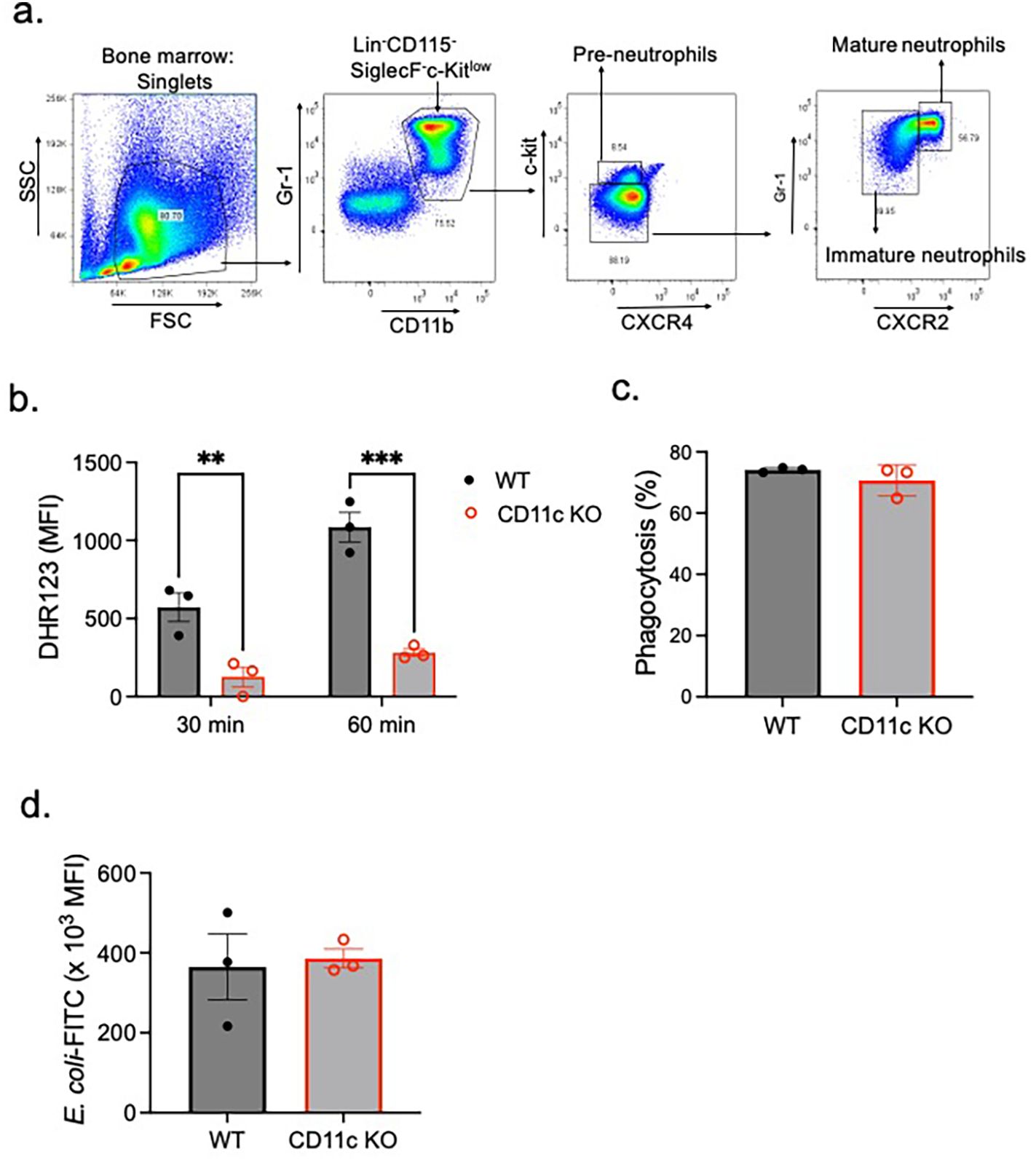 Figure 1. ROS and phagocytosis by mature WT and CD11c KO mature neutrophils. (A) Bone marrow mature neutrophils were sorted as Lin−Gr-1+CD11b+CXCR4−/lowc-kitlow/−CXCR2+ population (25, 26). Using mature neutrophils, (B) ROS formation and (C, D) phagocytosis were tested. (B) ROS formation was tested 30 and 60 min after PMA stimulation. Difference in DHR123 mean fluorescence intensity (MFI) between the PMA stimulation condition and control is shown. (C, D) Regarding phagocytosis, we presented % of mature neutrophils that phagocytized E. coli-FITC (C) and the MFI of phagocytized E. coli-FITC (D). Data were shown as mean ± S.E. Each dot represents the average value of each mouse. (B) Two-way ANOVA with Bonferroni post hoc analysis was used for statistical analysis. **p < 0.01, ***p < 0.001. (C, D) The Student’s t-test was used for statistical analysis. No significance was observed.