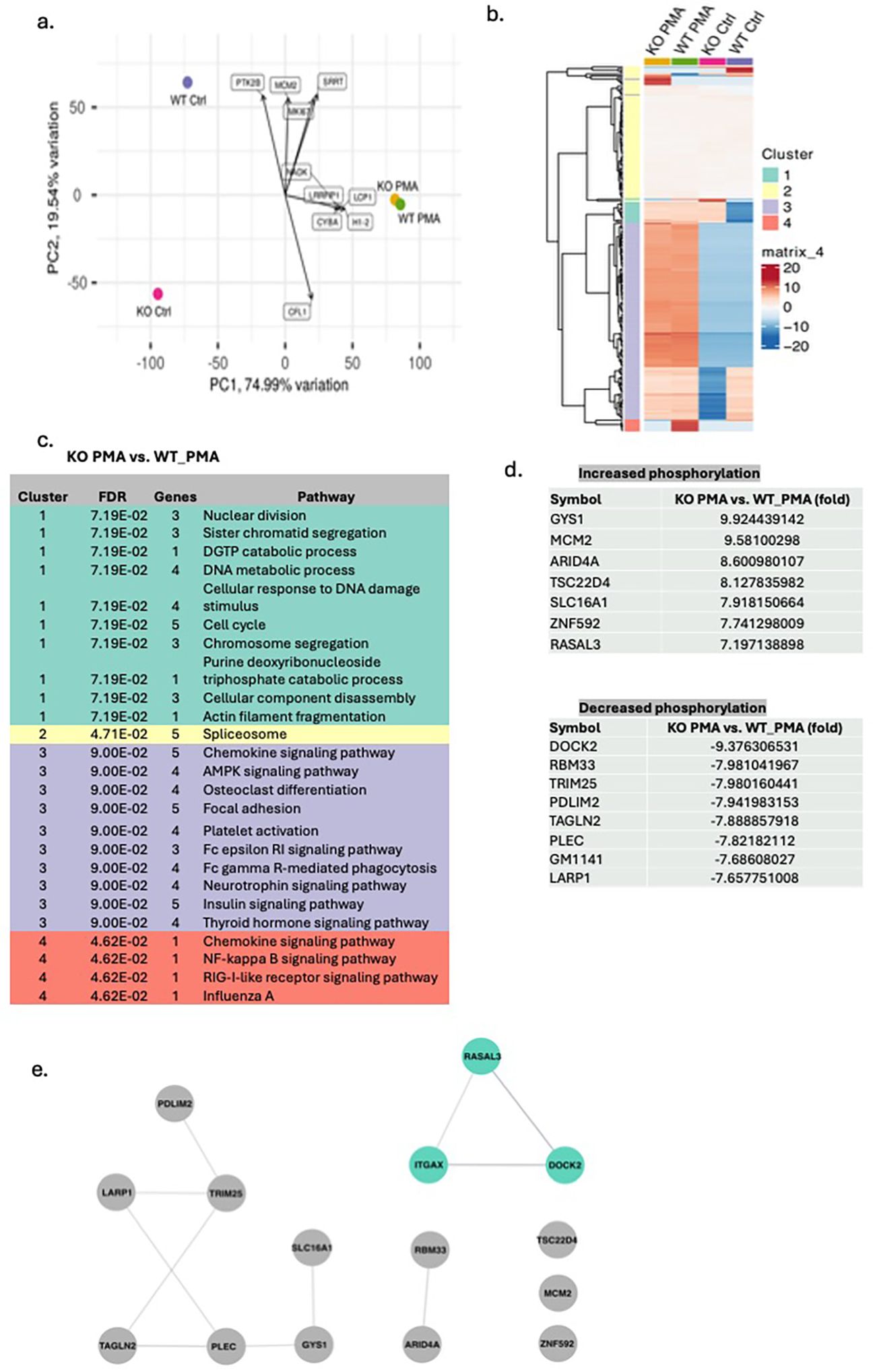 Figure 2. Phosphoproteomics of WT and CD11c KO mature neutrophils stimulated by PMA. The data from the phosphoproteomics experiment were subjected to (A) principal component analysis (PCA) and (B) cluster analysis. (C) In each cluster, functional annotation was also performed comparing CD11c mature neutrophils stimulated by PMA versus WT mature neutrophils stimulated by PMA. (D) The list of proteins whose difference in phosphorylation between WT and CD11c KO neutrophils was noted only in PMA stimulation conditions. (E) STRING analysis of the proteins in (D). Itgax = CD11c.
