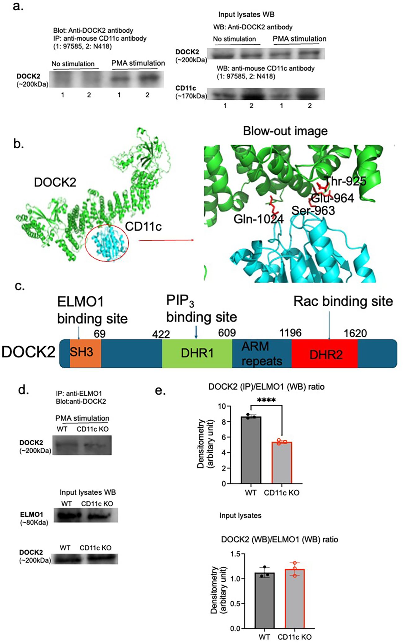 Figure 3. Interaction between CD11c and DOCK2. CD11c and DOCK2 interaction was probed by (A) immunoprecipitation and (B) in silico structure simulation. (A) Left panel: Lysed WT mature neutrophils with or without PMA stimulation (100 µg of protein lysates per lane were used for immunoprecipitation input) were immunoprecipitated with two different anti-mouse CD11c antibodies (97585 for 1 and N418 for 2) and probed with anti-DOCK2 antibody. Right panel: The expression of DOCK2 and CD11c in input lysates was shown. (B) AlphaFold 2 was used for in silico simulation. (C) The scheme of DOCK2 domains along with their binding proteins. SH3, N-terminal Src homology 3; ARM, armadillo; DHR, DOCK homology region. It is known that the binding of ELMO1 to DOCK2 at SH3 will enhance Rac activation. (D, E) The lysates of WT and CD11c KO mature neutrophils stimulated with PMA (100 µg of protein lysates each) were immunoprecipitated with anti-ELMO1 antibody, followed by probing with anti-DOCK2 antibody. In addition, ELMO1 and DOCK2 expression levels in input lysates were shown. Images were representatives of two independent experiments (D). (E) Using densitometry analysis, the ratio of DOCK2/ELMO1 was compared between WT and CD11c KO mature neutrophils. On the top panel, we compared DOCK2 expression on IP/ELMO1 expression on WB between WT and CD11c KO mature neutrophils stimulated with PMA. On the bottom panel, we compared DOCK2 expression on WB/ELMO1 expression on WB between WT and CD11c KO mature neutrophils stimulated with PMA. The Student’s t-test was used for statistical analysis. ****p < 0.0001.
