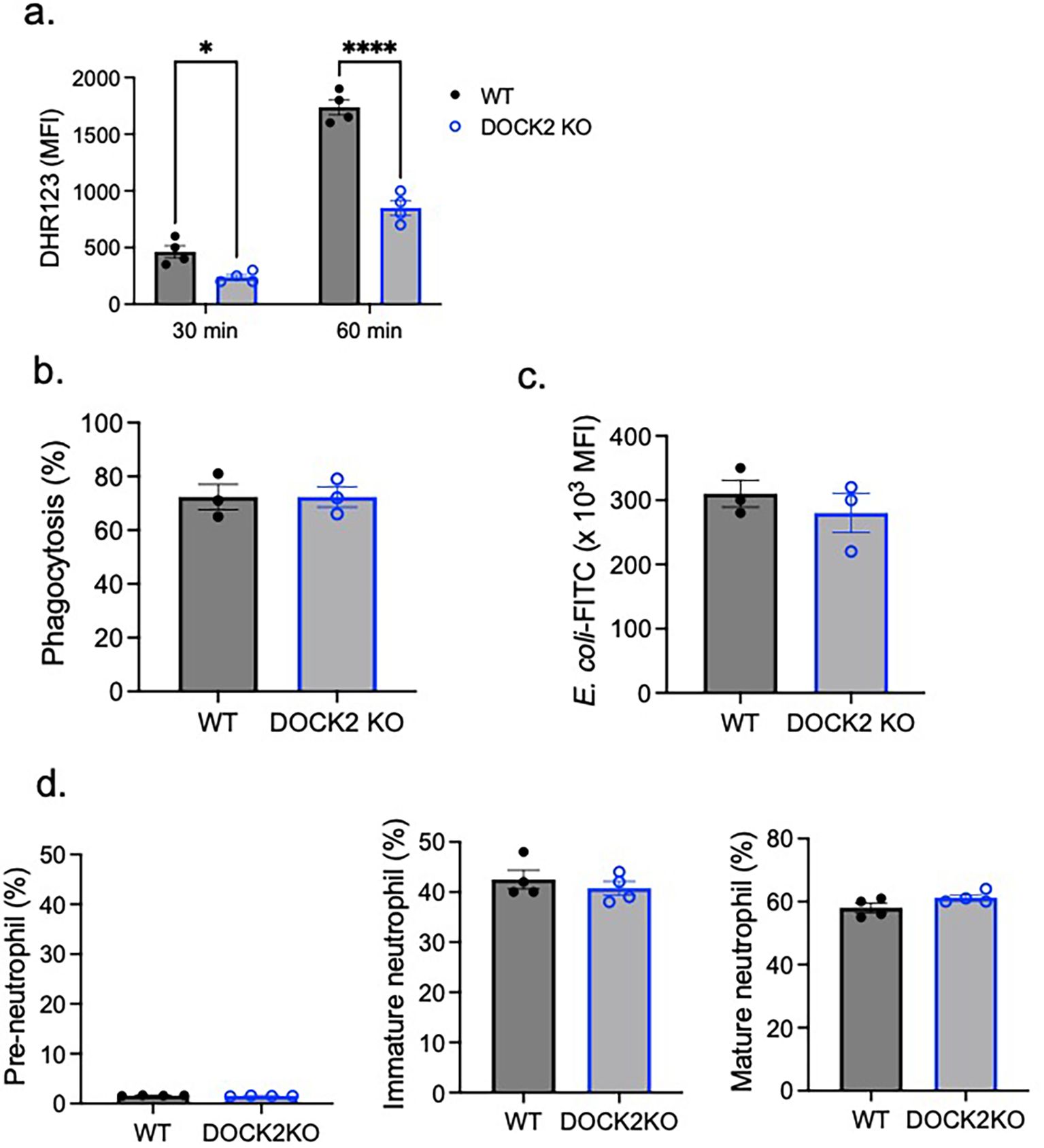 Figure 4. The role of DOCK2 in ROS, phagocytosis, and neutrophil maturation. WT and DOCK2 KO bone marrow neutrophils were tested for (A) ROS formation, (B, C) phagocytosis, and (D) maturation. Using mature neutrophils, (A) ROS formation and (B, C) phagocytosis were tested. (A) ROS formation was tested 30 and 60 min after PMA stimulation. Difference of DHR123 MFI between PMA stimulation condition and the control was shown. (B, C) Regarding phagocytosis, we presented % of mature neutrophils that phagocytized E. coli-FITC (B) and the MFI of phagocytized E. coli-FITC (C). (D) Pre-neutrophils, immature neutrophils, and mature neutrophils were gated as shown in Figure 1A. Pre-neutrophils, immature neutrophils, and mature neutrophils % among the total neutrophils were shown. Data were shown as mean ± S.E. Each dot represents the average value of each mouse. Two-way ANOVA with Bonferroni post hoc analysis (A) or the Student’s t-test (B–D) was used for statistical analysis. *p < 0.05, ****p < 0.0001. No statistical significance was observed.