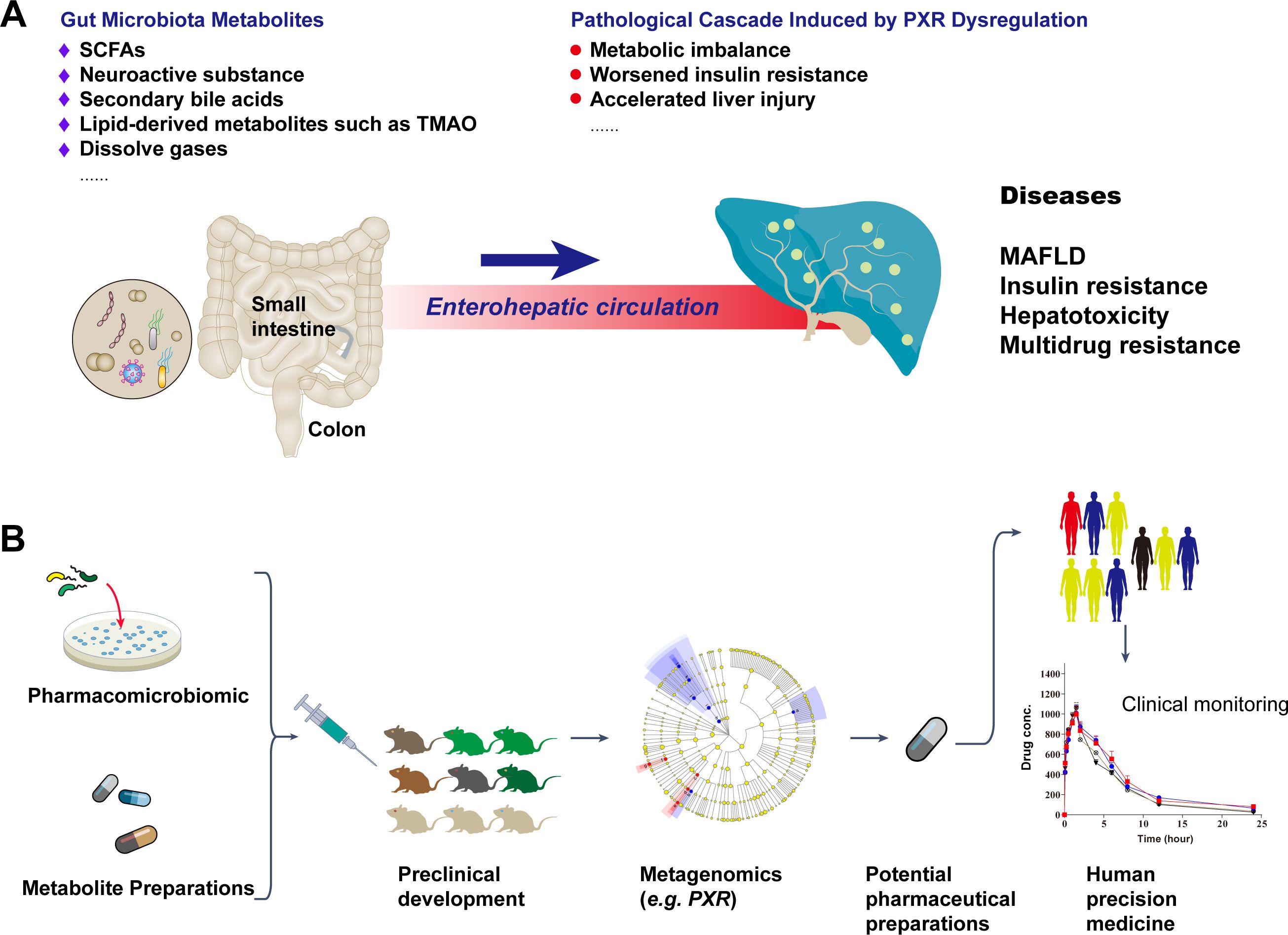 Figure 1. Gut microbiota metabolite-PXR axis in liver disease pathogenesis and the potential personalized therapeutic regimen development workflow. (A) Dysregulation of PXR: Impact of gut microbiota metabolites and gut-liver axis on liver metabolic disorders. (B) Potential roles of gut microbiota metabolites in hepatic metabolic transcription factors and a concise flowchart for personalized therapeutic development.
