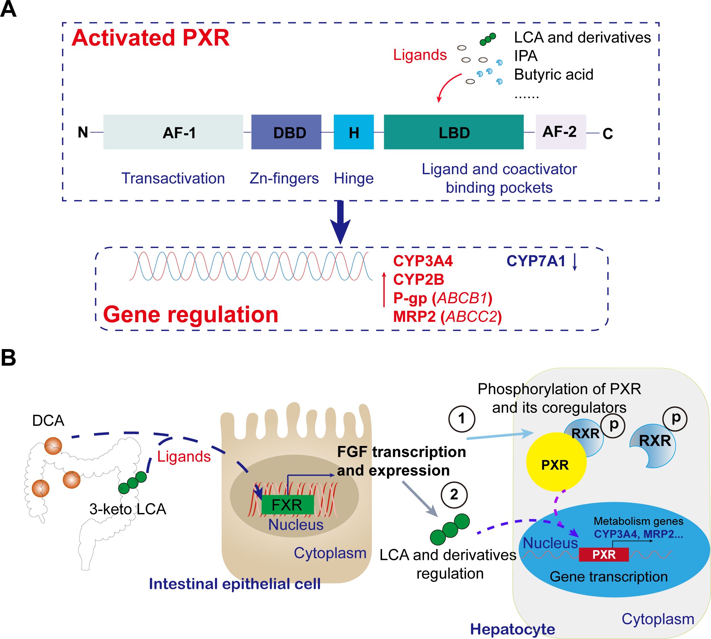 Figure 2. Recent mechanistic insights into gut microbiota metabolites modulating PXR transcriptional activity and functions. (A) Mechanism of activation of PXR by intestinally derived metabolites and its effects. In the direct activation pathway, microbial metabolites (e.g., 3-keto LCA, DCA, IPA) act as natural PXR ligands, binding via hydrogen bonds to conserved residues in the LBD. Activated PXR regulates target gene transcription, including upregulating CYP3A4, ABCB1, ABCC2, et al. expression and downregulating CYP7A1 expression. (B) Typical intestinally derived metabolites regulate the pathway of PXR in the liver. Microbial conversion of primary bile acids to secondary ones (e.g., DCA, 3-keto LCA) activates intestinal FXR, triggering FGF release. FGF modulating PXR through direct phosphorylation and indirect ligand regulation.