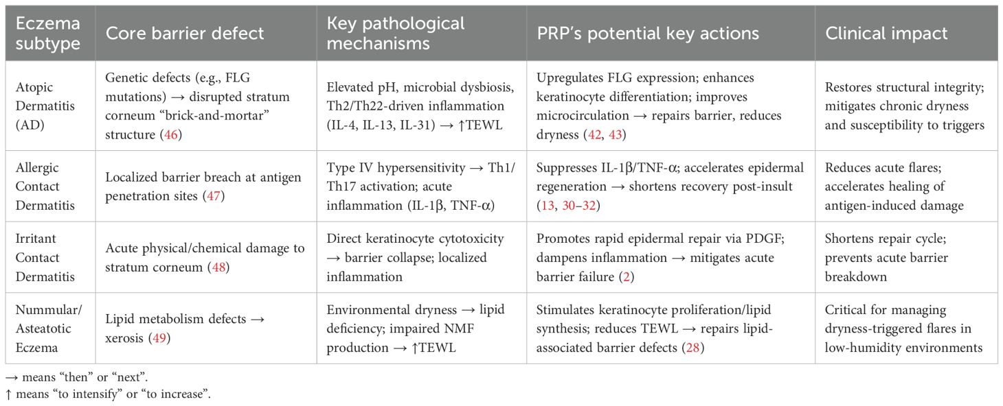 Consequently, PRP demonstrates subtype-specific therapeutic effects in eczema (Table 1): in AD, it may repair genetic defects by upregulating FLG via EGF/TGF-β, enhancing keratinocyte differentiation to restore barrier “brick-and-mortar” structure while alleviating chronic dryness via VEGF-improved microcirculation (42, 43); for allergic contact dermatitis, its anti-inflammatory actions (suppressing IL-1β/TNF-α) mitigate acute flares, and PDGF accelerates epidermal regeneration; in irritant contact dermatitis, PRP promotes repair via PDGF and dampens acute barrier disruption with anti-inflammatory factors like IL-1Ra; and for nummular/asteatotic eczema, it targets lipid metabolism to restore barrier function, with its TEWL-reducing moisturizing effect particularly beneficial in dry environments.