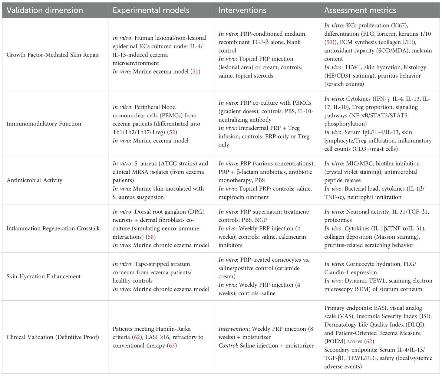 At the basic research level, in vitro cell models such as IL-4/IL-13-stimulated keratinocytes (KCs) (50) will assess PRP’s direct barrier repair capacity via growth factors, while in vivo animal models like chronic eczema mouse models (51) will visually demonstrate its overall improvement of eczema phenotypes, including pruritus, erythema, and desquamation. For immune dysregulation, in vitro co-culture of immune cells will evaluate PRP’s suppression of Th2/Th17 pro-inflammatory cytokines (IL-4, IL-17) and enhancement of Treg anti-inflammatory functions (FOXP3, IL-10) (13); in vivo experiments will further examine its modulation of systemic serum IgE and local cutaneous inflammatory infiltration mediated by CD3+ T cells and mast cells (53). Antimicrobial effects will be tested through in vitro antibacterial assays (54), complemented by in vivo measurements of bacterial load and inflammatory mediators such as IL-1β and TNF-α, to confirm PRP’s ability to inhibit S. aureus colonization and prevent infection-driven exacerbation (55–57). For inflammation regulation and tissue regeneration, neuro-immune co-culture models and chronic wound repair models (58, 59) will investigate PRP’s capacity to disrupt the “itch–scratch–inflammation cycle” by suppressing chronic inflammation and promoting collagen deposition. Skin hydration improvement will be evaluated using in vitro stratum corneum hydration assays and in vivo hydration monitoring via dynamic TEWL and scale morphology observation (60, 61). Finally, clinical randomized controlled trials (RCTs) will translate these mechanistic insights into efficacy outcomes using core endpoints such as the Eczema Area and Severity Index (EASI) score and recurrence rate (62, 63), while also evaluating safety parameters including local adverse reactions and systemic infection risk to ensure PRP’s scientific validity and clinical feasibility. The entire validation framework is closely aligned with eczema’s complex pathophysiological network involving barrier dysfunction, immune dysregulation, infection, and inflammation, thereby providing comprehensive experimental support for the “repair-oriented” therapeutic strategy.