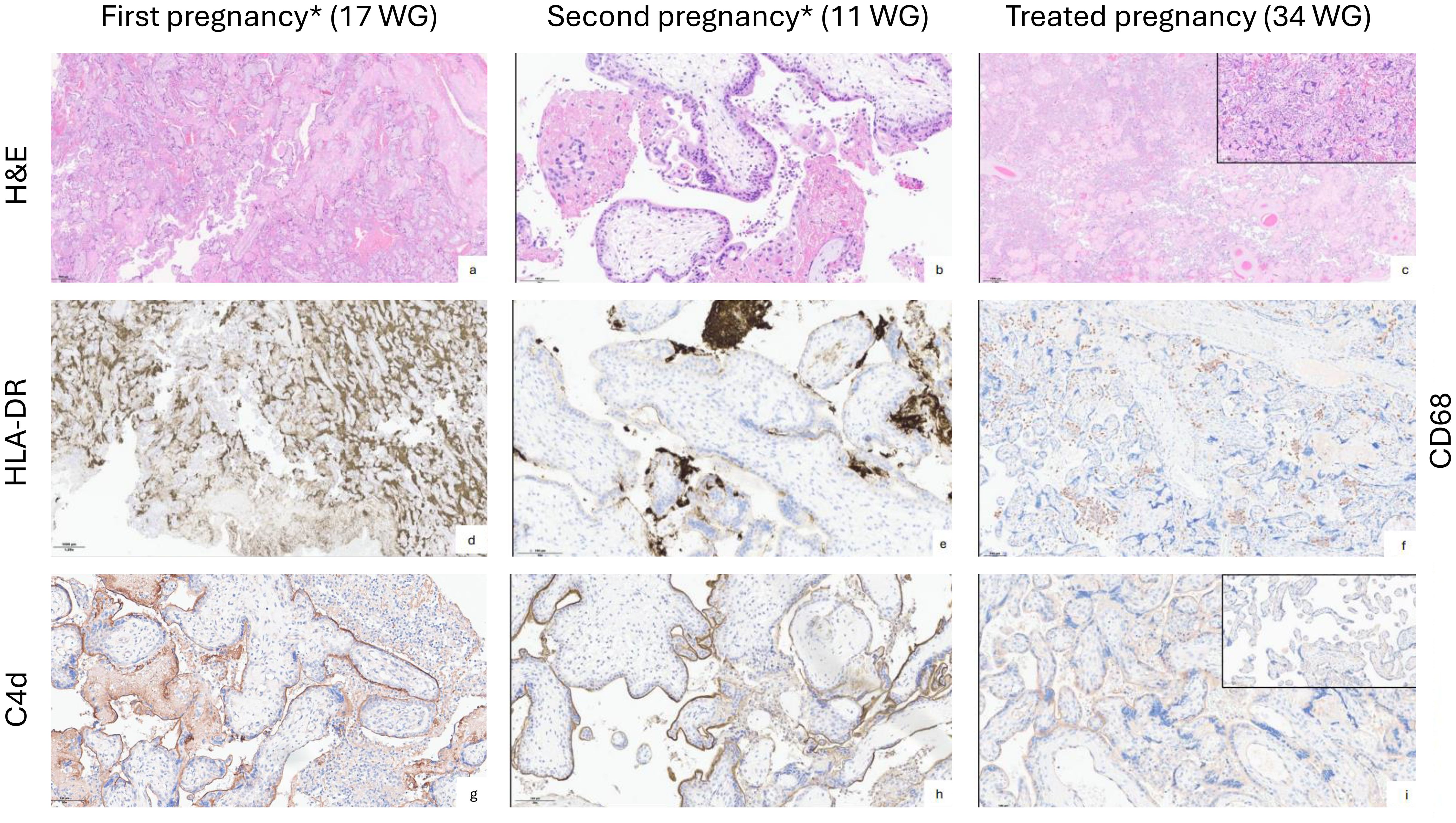 Figure 1. Histological analysis of the placentas comparing untreated and treated pregnancies in the index patient. (a, d, g) Pregnancy terminated at 17 WG showing chronic intervillositis (a: Hematoxylin and eosin, H&E, x4) with sheets of HLA-DR positive histiocytes filling the intervillous space (d: HLA-DR clone CR3/43 monoclonal antibody, Santa Cruz Biotechnology, Inc., x1.25), with strong and diffuse apical C4d positivity of villous trophoblast in the presence of intervillous clusters of mononucleated inflammatory cells (g: anti-human C4d antibody (C4dpAb), Biomedica Immunoassays, x20). (b, e, h) Second pregnancy marked by miscarriage at 11 WG. Placental histology shows clusters of histiocytes and fibrin deposits in the intervillous space (b: H&E, x20), HLA-DR positive intervillous histiocytes and linear apical staining of the villous trophoblast (e: HLA-DR immunohistochemical staining, x20), strong and diffuse linear C4d staining of the villous trophoblast (h: C4d immunohistochemical staining, x20). (c, f, i) Placental parenchyma of the treated current pregnancy showing accelerated villous maturation, increased intervillous fibrin deposition and syncytial knots and foci of chronic intervillositis (inlet) (c: H&E, x1.25 and inlet x20), foci of chronic intervillositis with clusters of CD68+ histiocytes (f: monoclonal mouse anti-human CD68 (Dako, clone PG-M1), x10), faint linear C4d staining of the villous trophoblast in association with the chronic intervillositis foci (i: C4d immunohistochemical staining, x20. Inlet: no significant C4d staining in non-inflammatory areas). All placental examinations were performed by a pathologist specialized in perinatal pathology and with extensive experience in the field. The same person performed retrospective analysis of previous pregnancies material to confirm the findings and chose representative microphotographs for the figures. * The pregnancies were numbered restarting from 1 with the new partner.