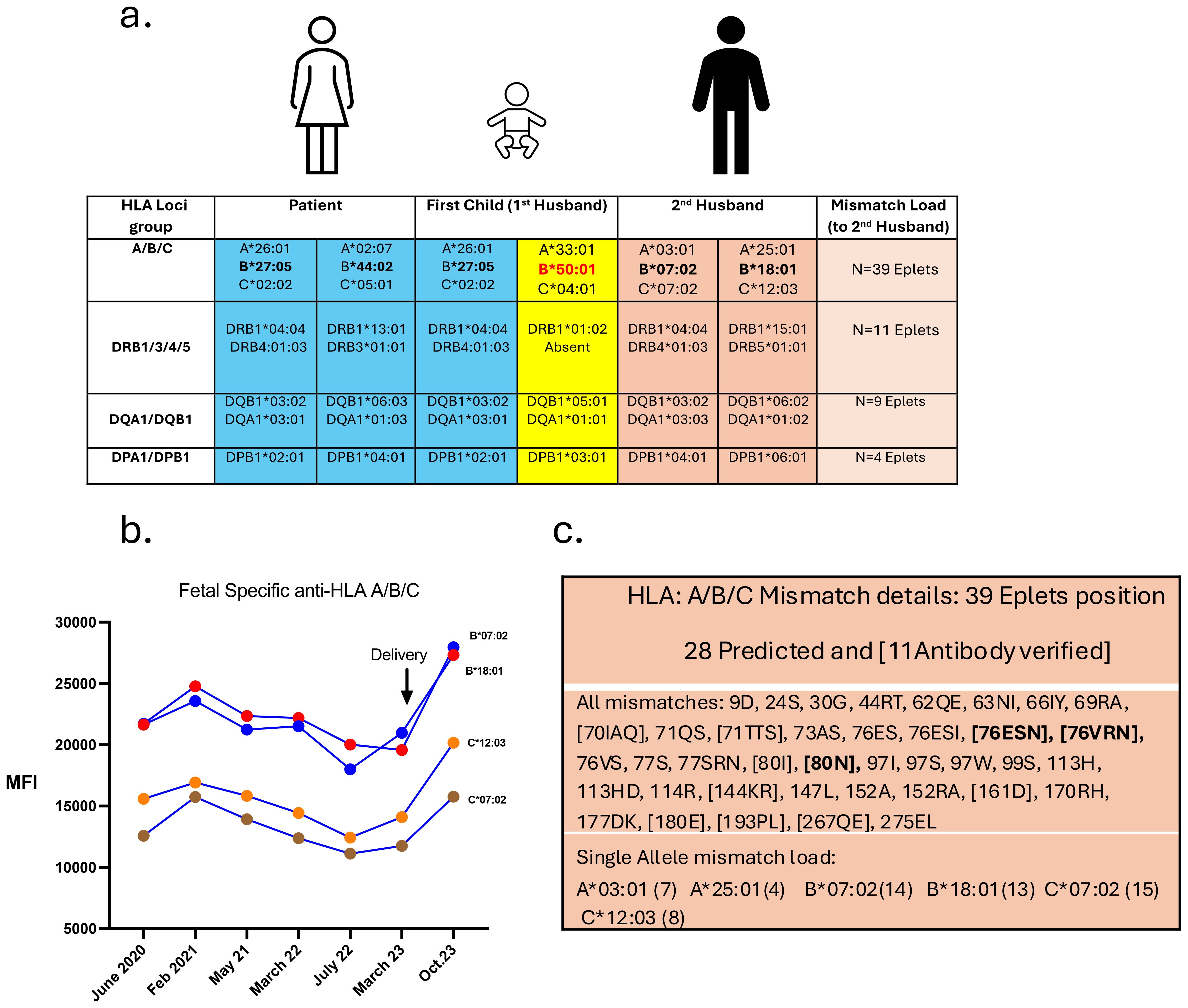Figure 2. HLA typing of the family and anti-HLA titer evolution throughout the treated pregnancy. (a) Table showing HLA genotyping: of the patient (in blue), her first child (first partner with the paternal haplotype shown in yellow), and the genotyping of the second partner (in orange). The calculated mismatch load between the patient and her second partner is depicted on the right column. The high mismatch load on the A/B/C allele is the result of the high HLA-B mismatch in bold: Patient Bw4/Bw4 group, 2nd partner Bw6/Bw6 group. The first pregnancy is acting as a pre-sensitizing event with the 1st partner bearing one HLA-B allele of the Bw6 group, in red. (b) Fetal specific anti-HLA Class I antibodies are depicted prior and after delivery. Anti-HLA B*07:02, B*18:01, C*12:03 and C*07:02 are represented, and correspond to the highly probable 80N antibody-verified Eplet (from the historical Bw6 group) after anti-HLA profile analysis. (c) Table showing the profile of the Eplet mismatch load between the patient and her second partner. Depicted in bold are the three main Eplets deducted from the antibody profile of the patient: the highly probable 80N Eplet that could be associated to both 76VRN and 76ESN Eplets.