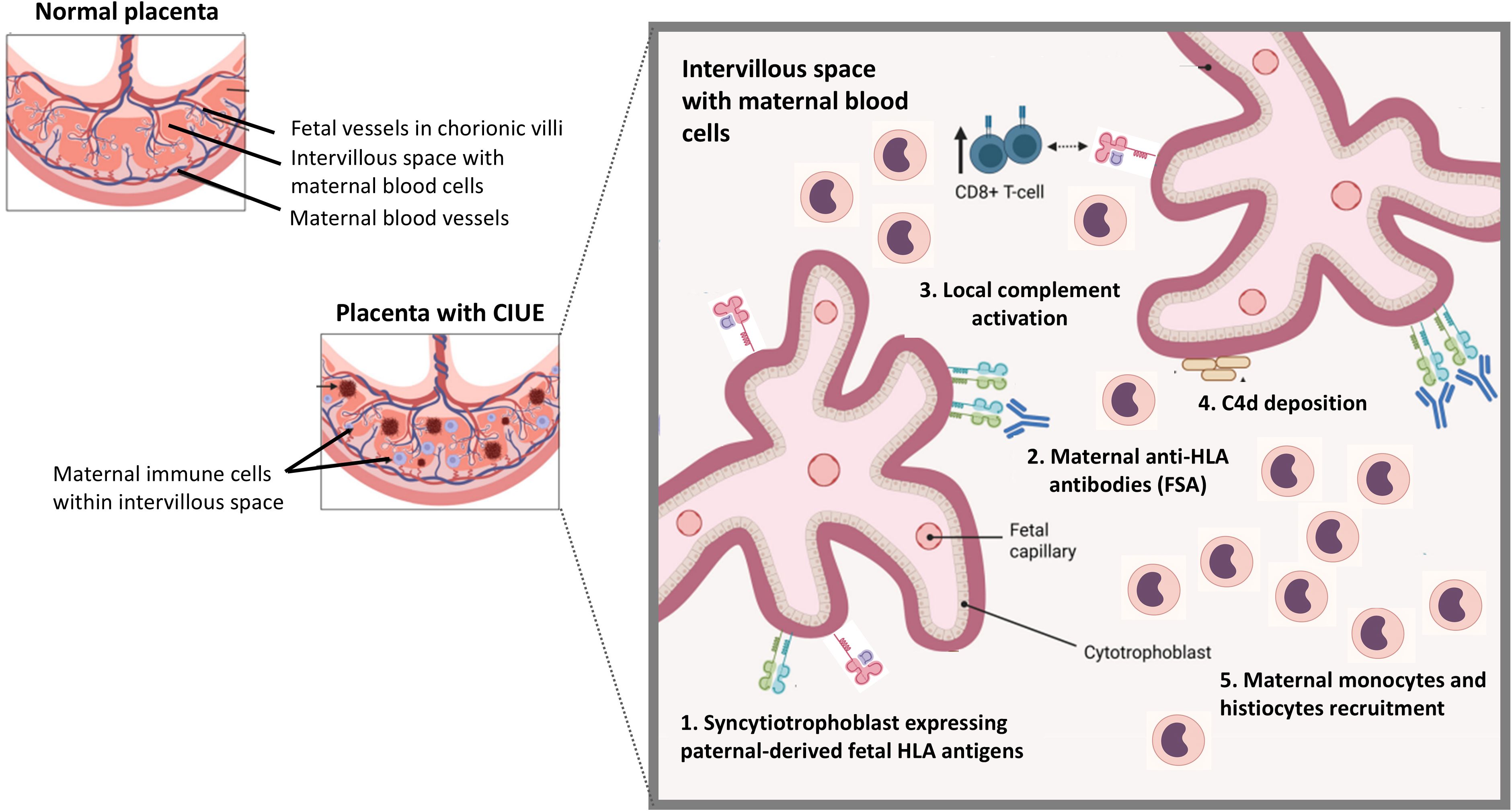 Figure 3. Schematic representation of chronic intervillositis of unknown etiology (CIUE). Left: comparison of a normal placenta and a placenta with CIUE, characterized by maternal immune cells infiltration of the intervillous (maternal) space. Right: proposed immunopathological cascade. (1) Syncytiotrophoblast expressing paternal-derived fetal HLA molecules (fetal antigens). (2) Maternal anti-HLA antibodies (fetal-specific anti-HLA antibodies, FSA) bind to trophoblast HLA molecules. (3) Complement activation ensues. (4) C4d deposition is observed at the trophoblast surface. (5) Recruitment of maternal monocytes and histiocytes amplifies inflammation within the intervillous space. This process mirrors antibody-mediated rejection in solid organ transplantation. Figure adapted from (33).