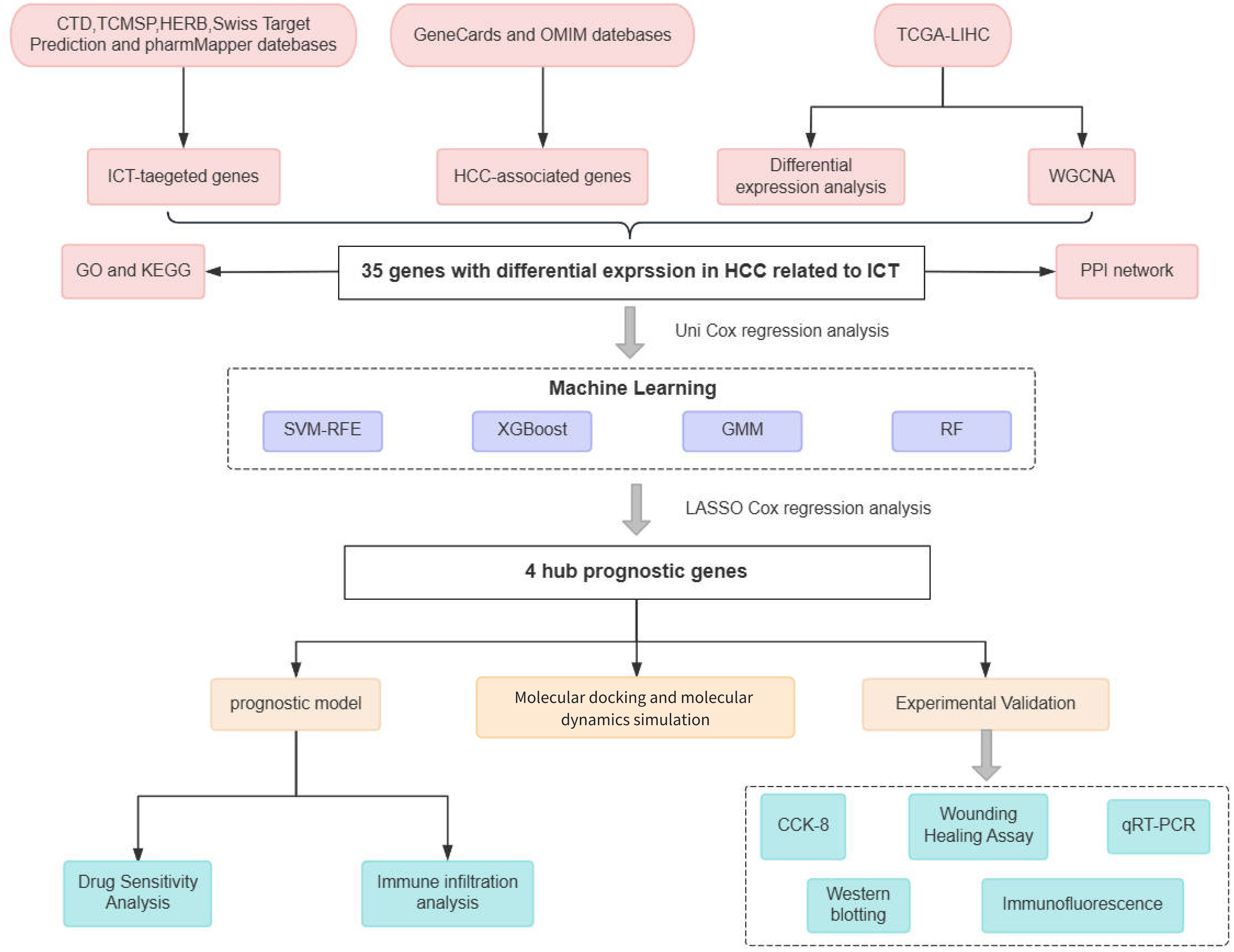 This study applied an integrative approach that combined network pharmacology and bioinformatics analyses to identify core genes targeted by ICT in HCC and to evaluate their prognostic significance. Based on ICT-related genes closely associated with survival outcomes, we constructed a prognostic model and further explored the relationship between gene expression levels and pharmacological sensitivity. Molecular docking was then performed to predict the binding affinities of ICT with its potential target proteins. To substantiate these computational findings, experimental validation was carried out using human hepatoma HepG2 cell lines, confirming the inhibitory effects of ICT on cell proliferation, migration, and target gene expression. By integrating advanced computational methodologies with in vitro experiments, this investigation not only elucidates the prognostic and therapeutic relevance of ICT-related genes in HCC but also provides novel insights and a theoretical foundation for the development of effective treatment strategies utilizing small-molecule compounds derived from TCM. The flowchart of this study is shown in Figure 1.
