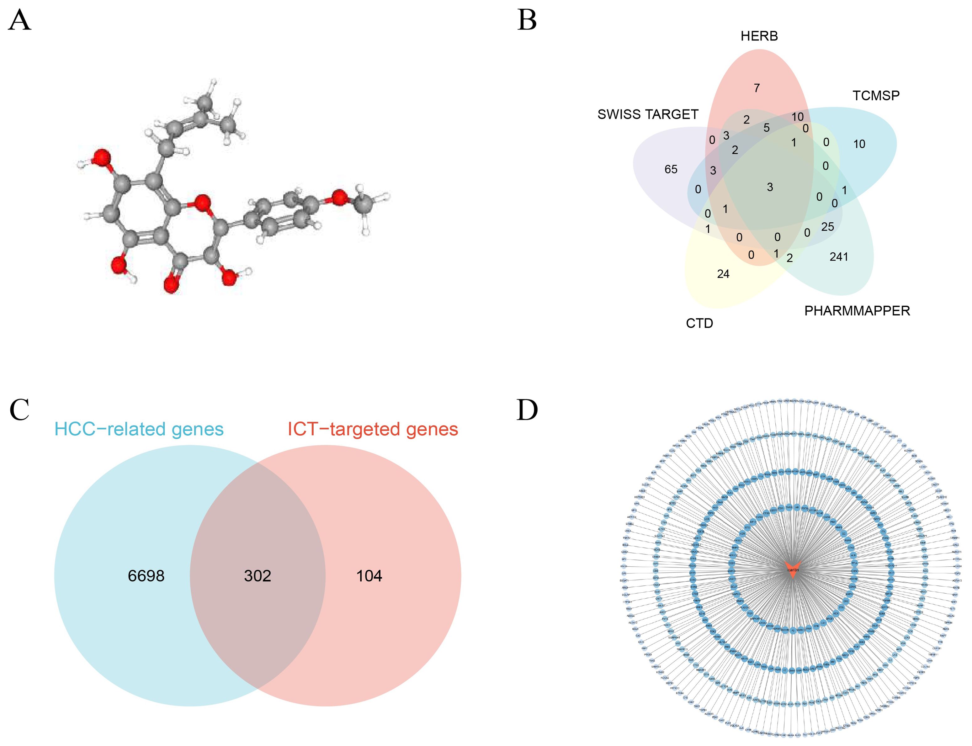 Figure 2. Network pharmacology analysis of ICT. (A) Three-dimensional chemical structure of ICT (PubChem CID: 5318980 with the molecular formula C21H20O6). (B) Candidate therapeutic targets of ICT retrieved from five public databases. (C) Venn diagram illustrating the overlapping genes between potential ICT targets and HCC-associated genes. (D) PPI network of ICT targets.