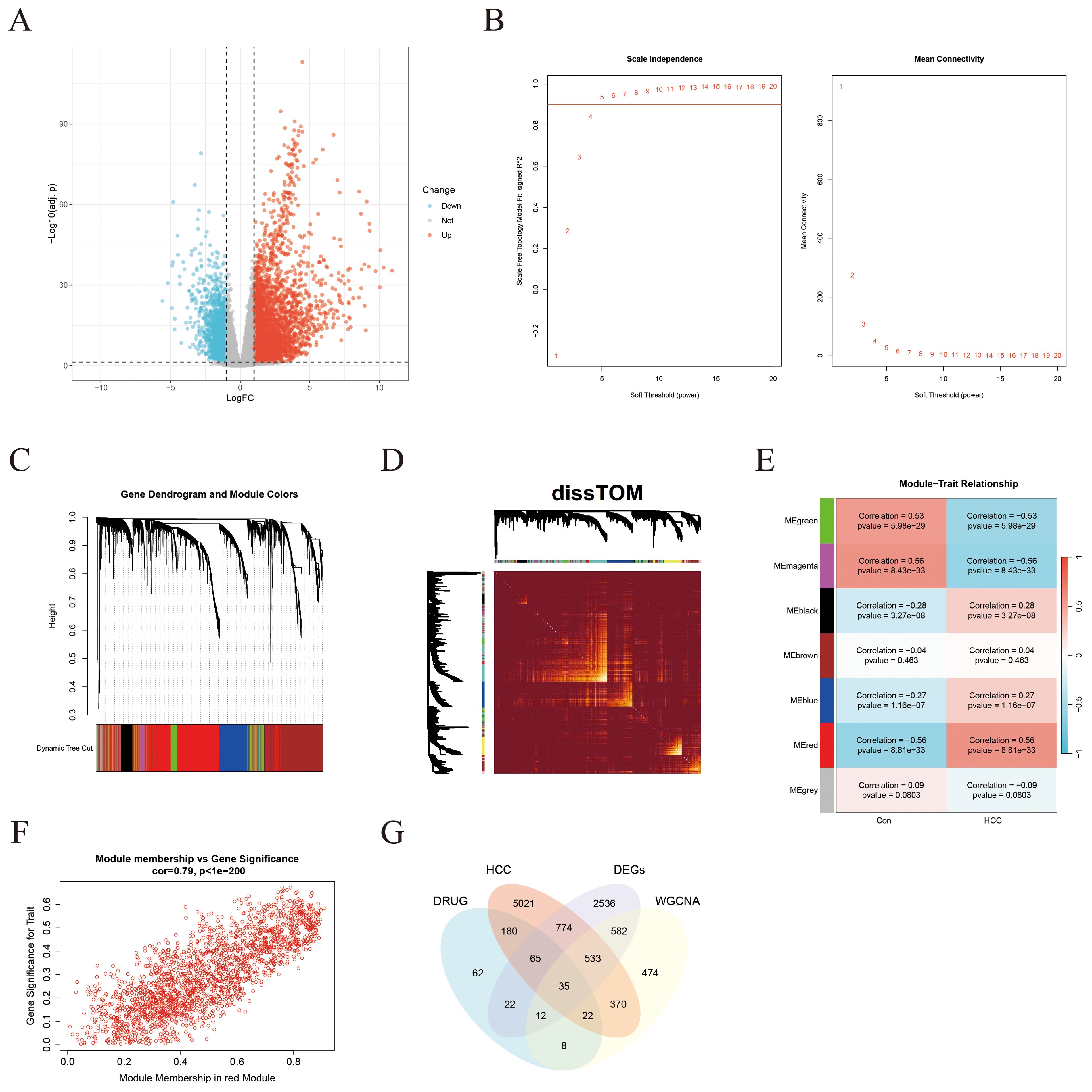 Figure 3. Identification of ICT-associated DEGsin HCC through integrated DEA and WGCNA. (A) Volcano plot illustrating DEGs between HCC tumor tissues and adjacent normal tissues in the TCGA-LIHC cohort. (B) Network topology plots depicting scale-free fit and mean connectivity across varying soft-thresholding powers. (C) Hierarchical clustering dendrogram of DEGs. (D) Heatmap showing the dissTOM among all identified gene modules. (E) Correlation heatmap between gene modules (represented by colors) and clinical traits. (F) Scatter plot demonstrating the positive correlation between gene significance (GS) and module membership (MM) for the red module in tumor tissues. (G) Venn diagram illustrating the intersection among HCC DEGs, ICT-related targets, HCC-derived module genes, and HCC-associated disease genes.