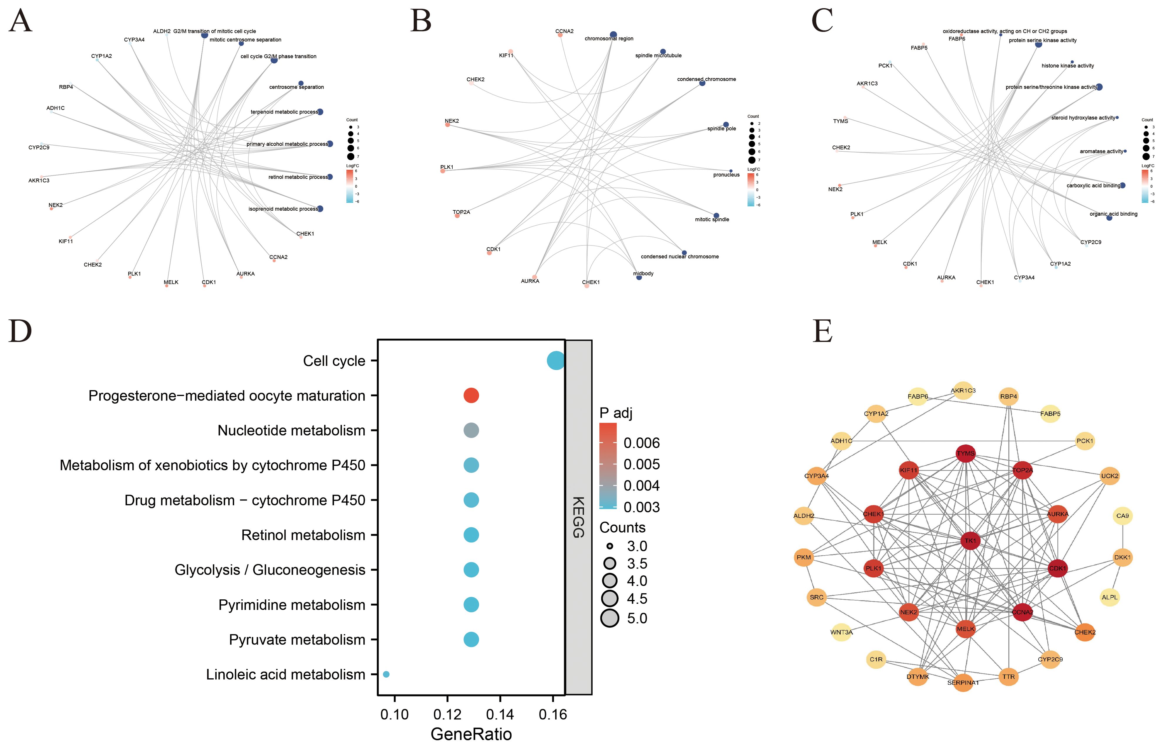Functional enrichment analyses were carried out on the 35 overlapping genes, encompassing GO and KEGG pathway annotations. In the BP category, the genes were predominantly enriched in pathways associated with the G2/M phase transition of the cell cycle, terpene metabolism, primary alcohol metabolism, and retinol metabolism (Figure 4A). For cellular components (CC), the genes were mainly linked to structures such as chromatin, spindle microtubules, and condensed chromatin (Figure 4B). Regarding molecular functions (MFs), momentous enrichment was detected in oxidoreductase activity, carboxylic acid binding, organic acid binding, and protein serine/threonine kinase activity (Figure 4C). KEGG pathway analysis indicated that ICT may exert therapeutic effects on HCC by modulating key signaling pathways, including the cell cycle, nucleotide metabolism, glycolysis/gluconeogenesis, and drug metabolism pathways (Figure 4D). To further investigate interactions among these target proteins, the genes were analyzed utilizing the STRING database to exclude non-interacting targets, and the resulting dataset was imported into Cytoscape 3.10.2 to build a PPI network (Figure 4E).