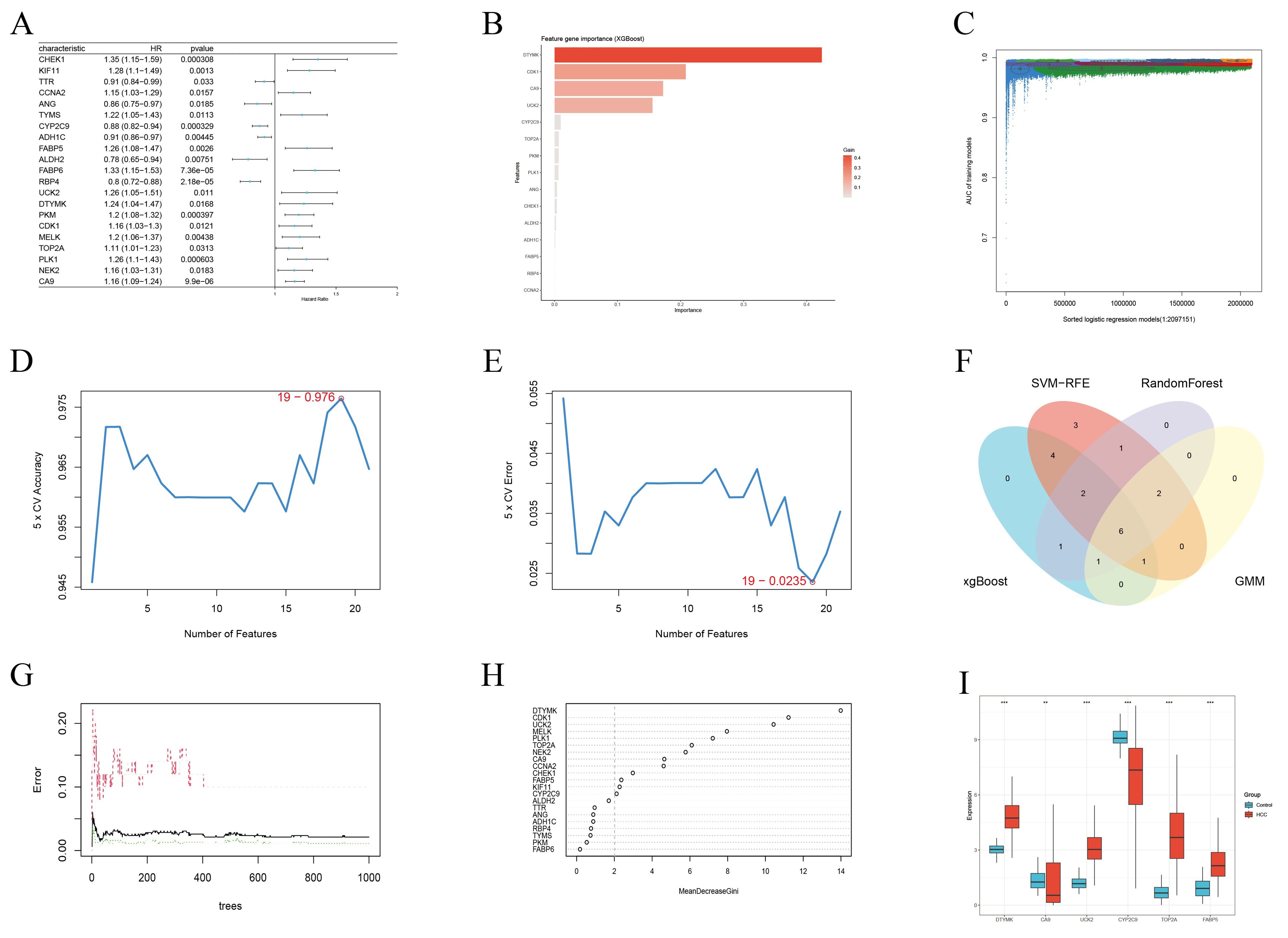Figure 5. Candidate prognostic genes were identified through integration of Cox regression analysis and machine learning algorithms. (A) Univariate Cox regression analysis identified 21 genes significantly associated with OS. (B) Core diagnostic markers selected using the XGBoost algorithm (n=15). (C) Identification of significant genes via GMM regression analysis (n=10). (D, E) Feature genes detected by the SVF-RFE method (n=19). (F) Venn diagram showing the intersection of results from four MLAs used to define candidate prognostic genes. (G, H) Key predictive features selected by the random forest algorithm (n=13). (I) Box plots depicting the expression levels of six candidate prognostic genes in the TCGA-LIHC cohort. * < 0.05, ** < 0.01, *** < 0.001.