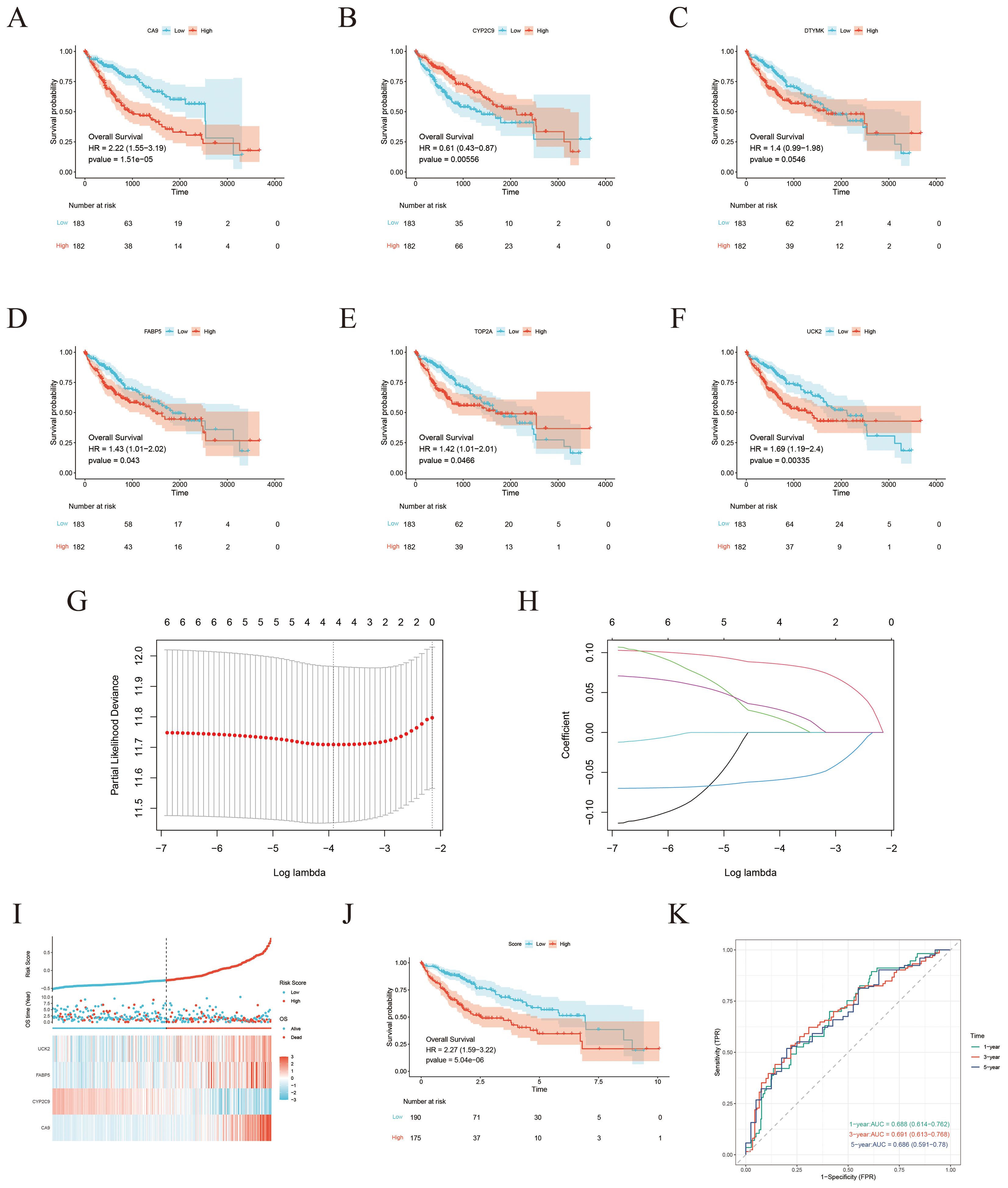 Figure 6. Development of a risk score model for prognostic prediction. (A–F) K-M survival curves demonstrating the prognostic value of CA9, CYP2C9, DTYMK, FABP5, TOP2A, and UCK2 expression levels in the TCGA-LIHA cohort. (G) Establishment of the prognostic model using LASSO Cox regression analysis. (H) LASSO coefficient profile across varying lambda values. (I) Risk score distribution, survival status, and expression heatmap ofthe four ICT-associated genes in the TCGA-LIHA cohort. (J) Kaplan–Meier survival analysis comparing OS between higher-risk and lower-risk groups. (K) Time-dependent ROC curves evaluating the predictive performance of the risk score model for 1-year, 3-year, and 5-year survival in theTCGA-LIHC cohort.