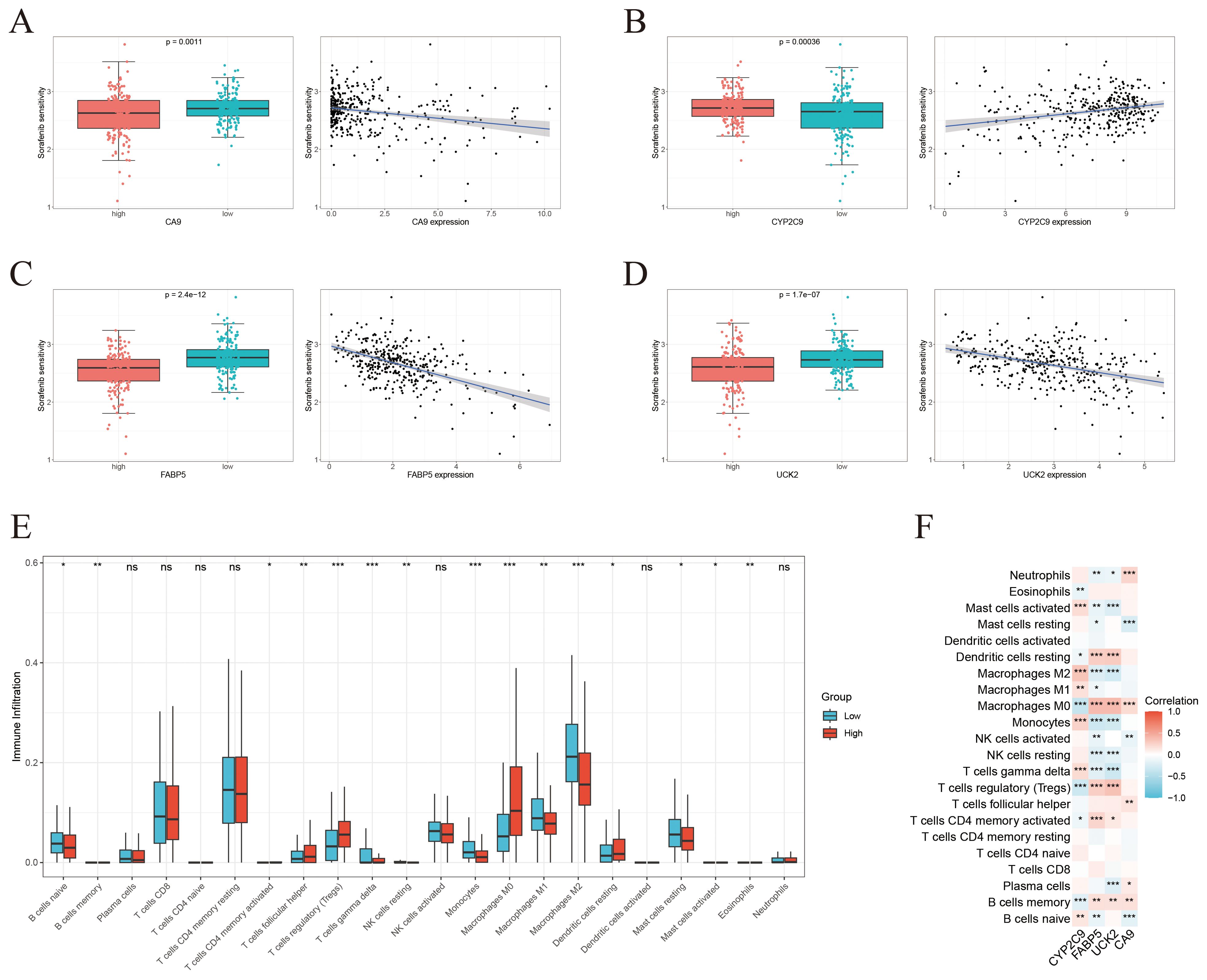 Figure 7. Drug sensitivity profiling and immune infiltration characterization. (A-D) Individual analysis of the correlation between the expression level of each core gene (CA9, CYP2C9, FABP5, UCK2) and sorafenib sensitivity. (E) Comparison of immune cell infiltration proportions between the high-risk and low-risk groups defined by the four-gene risk score. (F) Correlation analysis between the continuous risk score and the infiltration levels of various immune cells. * < 0.05, ** < 0.01, *** < 0.001.