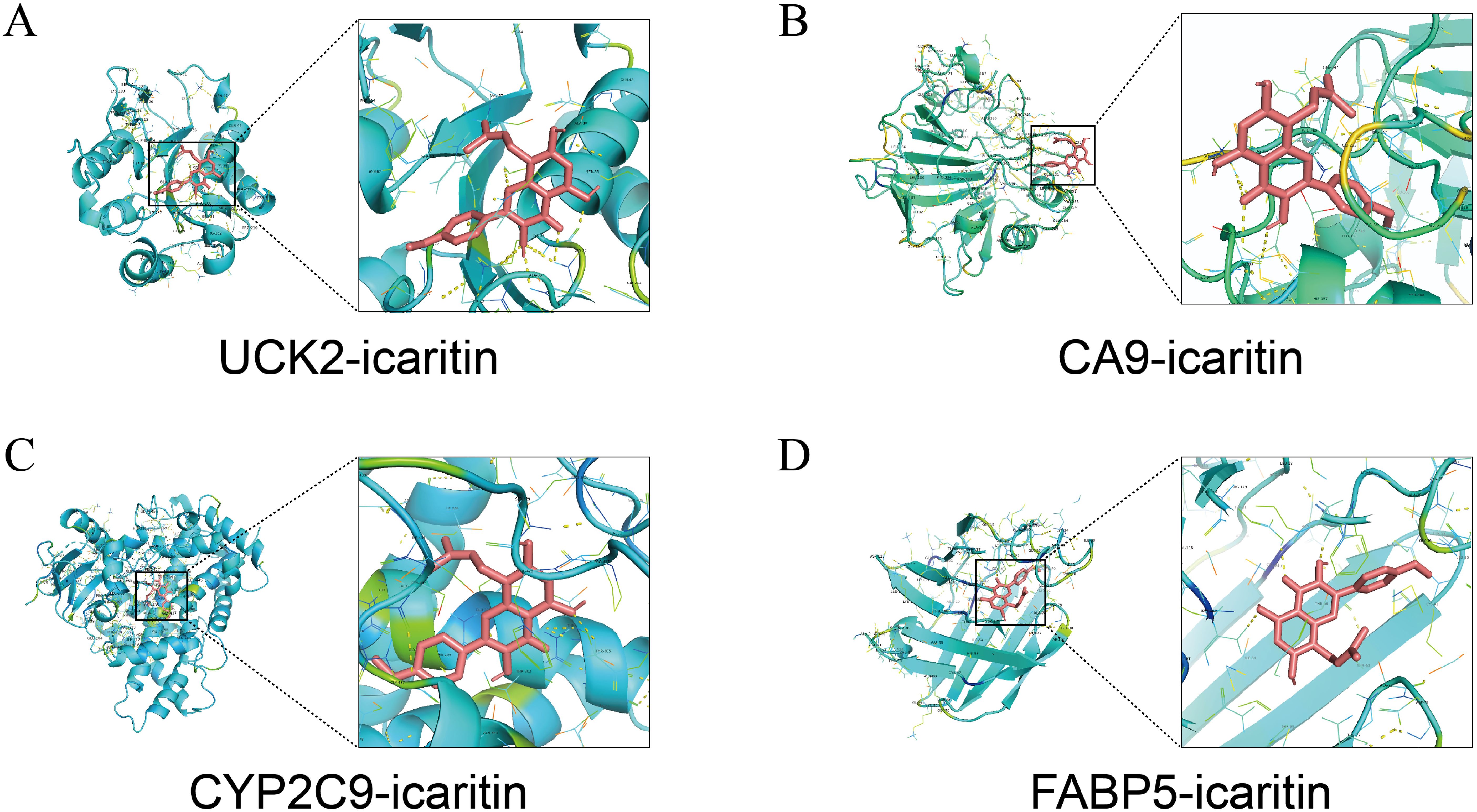 Figure 8. Molecular docking patterns between ICT and its target proteins. (A) UCK2. (B) CA9. (C) CYP2C9. (D) FABP5.