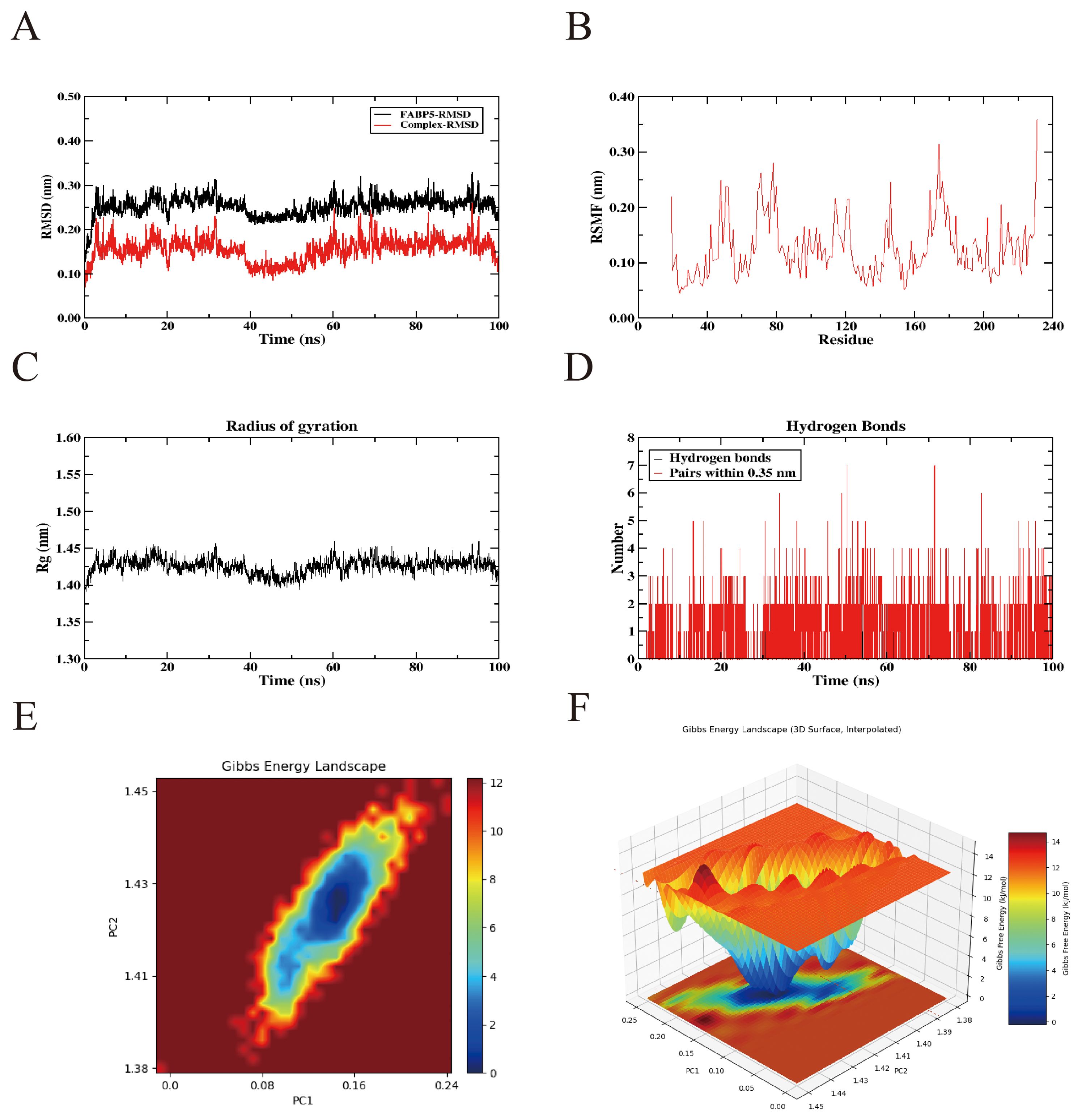 Figure 9. Molecular dynamics simulation results of the interaction between icaritin and the FABP5 protein. (A) Root-mean square deviation values of the FABP5 protein and the FABP5 protein–icaritin saponin complex. (B) Changes in protein flexibility during molecular dynamics simulation of icaritin. (C) Radius of gyration profile of the protein-icaritin complex. (D) Hydrogen bond dynamics during molecular dynamics simulations. (E, F) Two-dimensional and three-dimensional visualization of the free energy landscape.