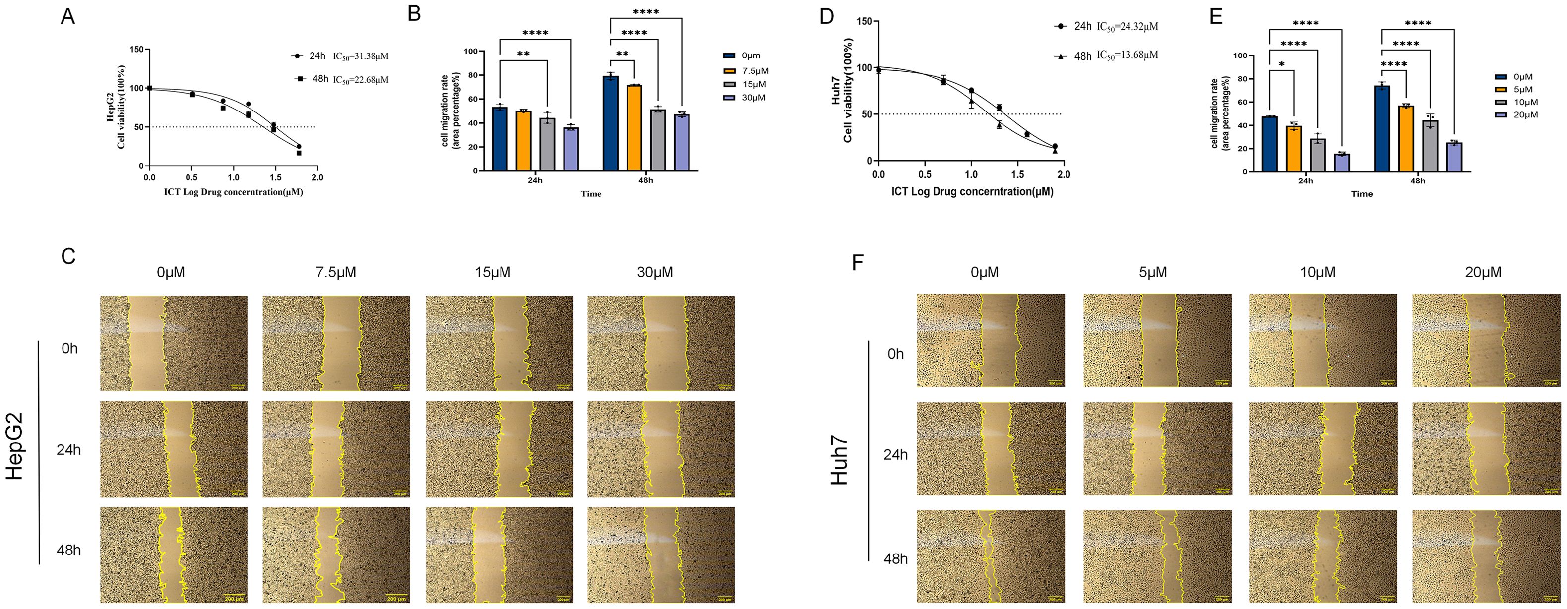 Figure 10. Effect of ICT on the proliferation and migration of hepatocellular carcinoma HepG2 and Huh7 cells. (A) Cytotoxic effect of ICT on HepG2 cells. (B, C) Quantification and representative images of the wound healing assay in HepG2 cells treated with various concentrations of ICT. (D) Cytotoxic effect of ICT on Huh7 cells. (E, F) Quantification and representative images of the wound healing assay in Huh7 cells treated with various concentrations of ICT. (*p < 0.05, **p < 0.01, ****p < 0.0001, scale bar: 200μm; data from three biological replicates, with three regions analyzed per replicate).