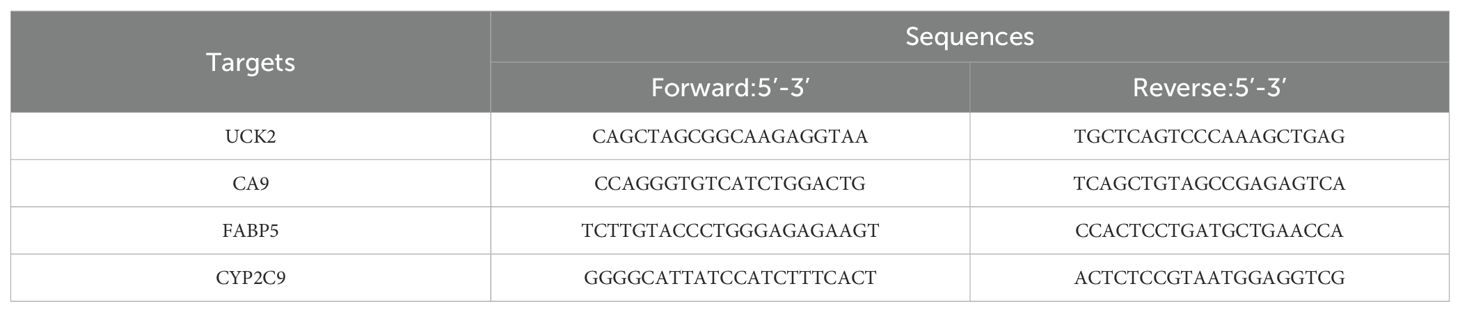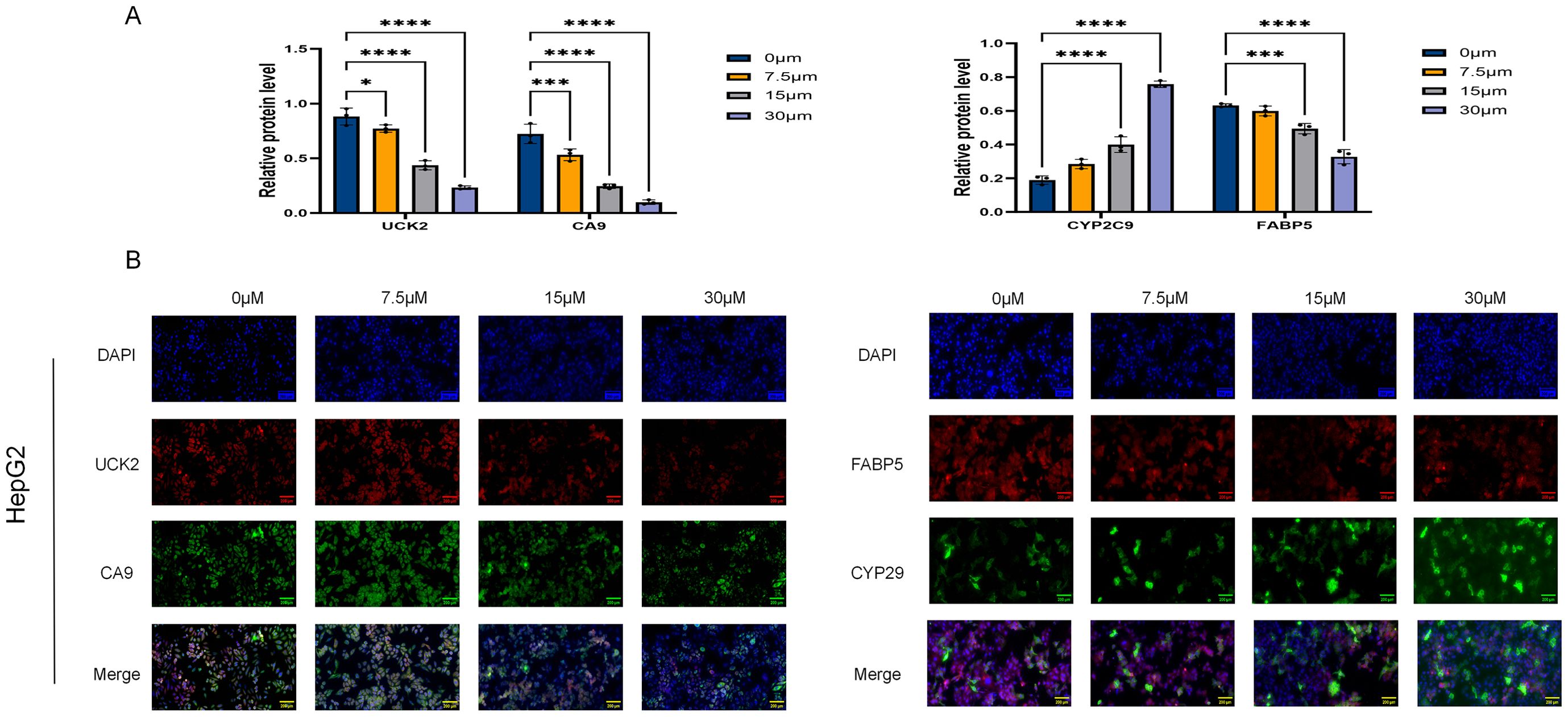 Double-target immunofluorescence staining was performed using the tyramide signal amplification (TSA) technique. Briefly, cells were permeabilized for 10 minutes at room temperature with 0.1% Triton X-100 (T8200, Solarbio, China) and rinsed three times with PBS. Nonspecific binding was blocked by incubating the cells with 10% goat serum (PN0038, pinuofei Biotech, China) at 37°C for 30 minutes. The cells were then incubated with primary antibodies (Wuhan Sanying, China: Fatty acid-binding protein 5 (FABP5)/12348-1-AP/1:200, UCK2/66822-1-IG/1:200, carbonic anhydrase 9 (CA9)/11071-1-AP/1:200, CYP2C9/16546-1-AP/1:500), the same antibodies used for Western blotting (WB), either for 2 hours at 37 °C or for the entire night at 4°C. Following primary incubation, HRP-conjugated goat anti-rabbit IgG secondary antibody (PN0046, pinuofei Biotech) was applied at 37°C for 1 hour. After extensive washing with PBST (it is PBS, which has 0.1% Tween-20), TSA was performed sequentially with TYR-488 (PN0100, pinuofei Biotech) and TYR-555 (PN0101, pinuofei Biotech) at 37°C for 30 minutes each. Nuclei were counterstained with DAPI (PN0015, pinuofei Biotech) for 5 minutes, and samples were mounted using an anti-fluorescence quenching mounting medium (PN0024, pinuofei Biotech) and stored at 4°C in the dark. Fluorescence images were acquired using a fluorescence microscope, and the fluorescence intensity was quantitatively analyzed using ImageJ software. Finally, the relative protein expression level was determined by comparing the mean fluorescence intensity of the target protein to that of DAPI. PBST was used for all washing steps throughout the procedure, and working concentrations of all antibodies and reagents were pre-optimized in preliminary experiments to ensure optimal staining efficiency and signal specificity.