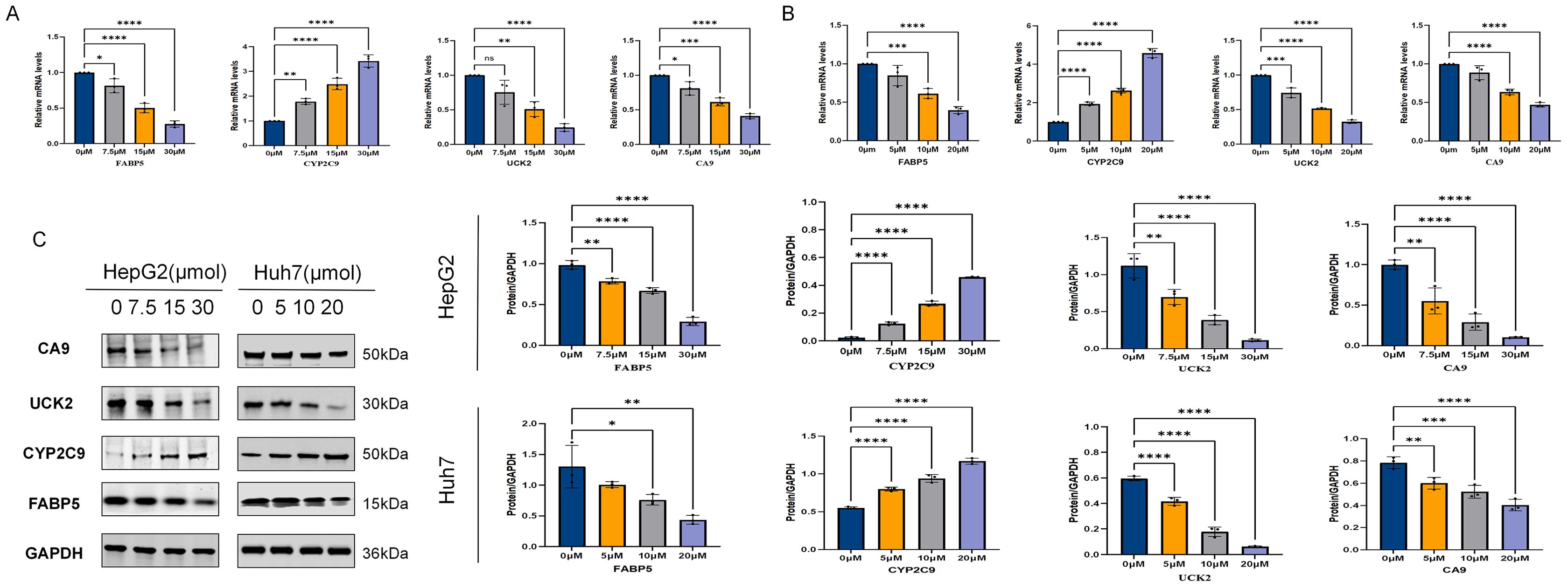 Figure 12. Effect of ICT on multi-target protein expression in HepG2 and Huh7 cells. (A) mRNA expression levels of relevant genes in HepG2 cells after 24-hour treatment with different concentrations of ICT, as determined by qPCR. (B) mRNA expression levels of relevant genes in Huh7 cells after 24-hour treatment with different concentrations of ICT, as determined by qPCR. (C) Western Blot analysis was used to determine the expression changes and quantification of CA9, UCK2, FABP5, and CYP2C9 proteins in HepG2 and Huh7 cells treated with different concentrations of ICT for 24 hours.(*p < 0.05, **p < 0.01, ***p < 0.001, ****p < 0.0001; Data are presented as the mean ± standard deviation (Mean ± SD) from at least three independent experiments (n = 3).