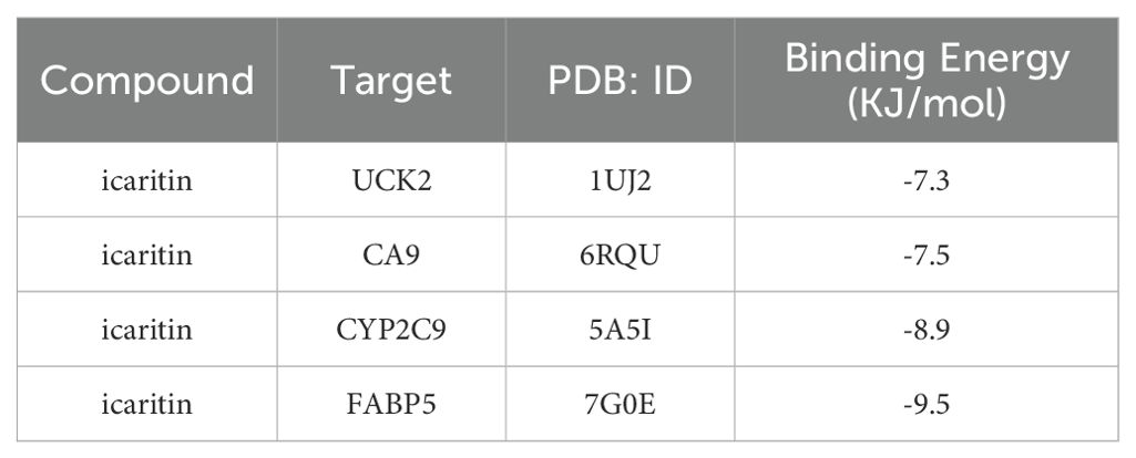 Molecular docking analysis revealed that ICT exhibited negative binding energy values with the key target proteins CA9, UCK2, FABP5, and CYP2C9 (Table 2), indicating direct interactions with amino acid residues within these proteins. Lower binding energies correspond to more stable and favorable molecular interactions, with values below −5.0 kJ/mol reflecting favorable binding affinity and values below −7 kJ/mol indicating strong binding activity. Notably, all four core targets demonstrated binding energies below −7 kJ/mol, suggesting their critical involvement in ICT’s therapeutic mechanism against HCC. The docking results were visualized in Figure 8. Molecular docking analysis revealed that ICT exhibited binding energies of -7.3, -7.5, -8.9, and -9.5 kJ/mol with the four core target proteins UCK2, CA9, CYP2C9, and FABP5, respectively. Among these, ICT showed the strongest binding affinity toward FABP5. Therefore, FABP5—the protein with the highest binding affinity—was selected for subsequent MD simulations to further validate and characterize the stability of the binding interaction.
