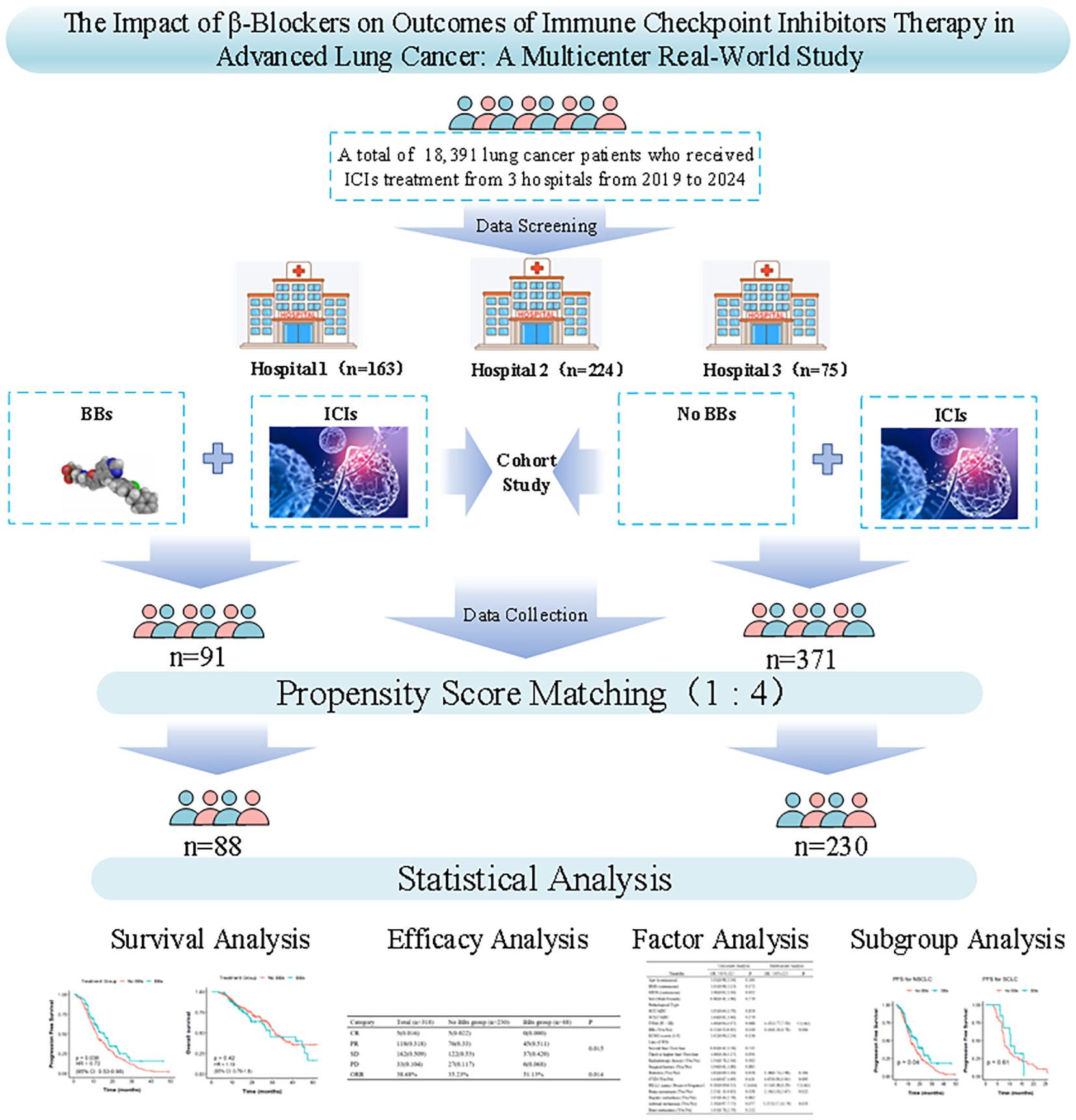 Given the widespread use of BBs in clinical oncology and their potential immunomodulatory effects, we hypothesized that inhibition of β-adrenergic signaling may enhance the efficacy of immunotherapy in lung cancer. Therefore, we conducted this multicenter real-world retrospective study to investigate the impact of BBs use on the prognosis of advanced lung cancer patients receiving immunotherapy.