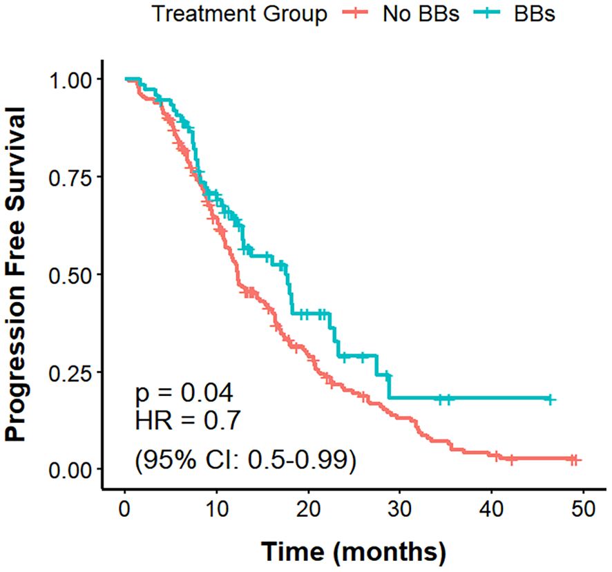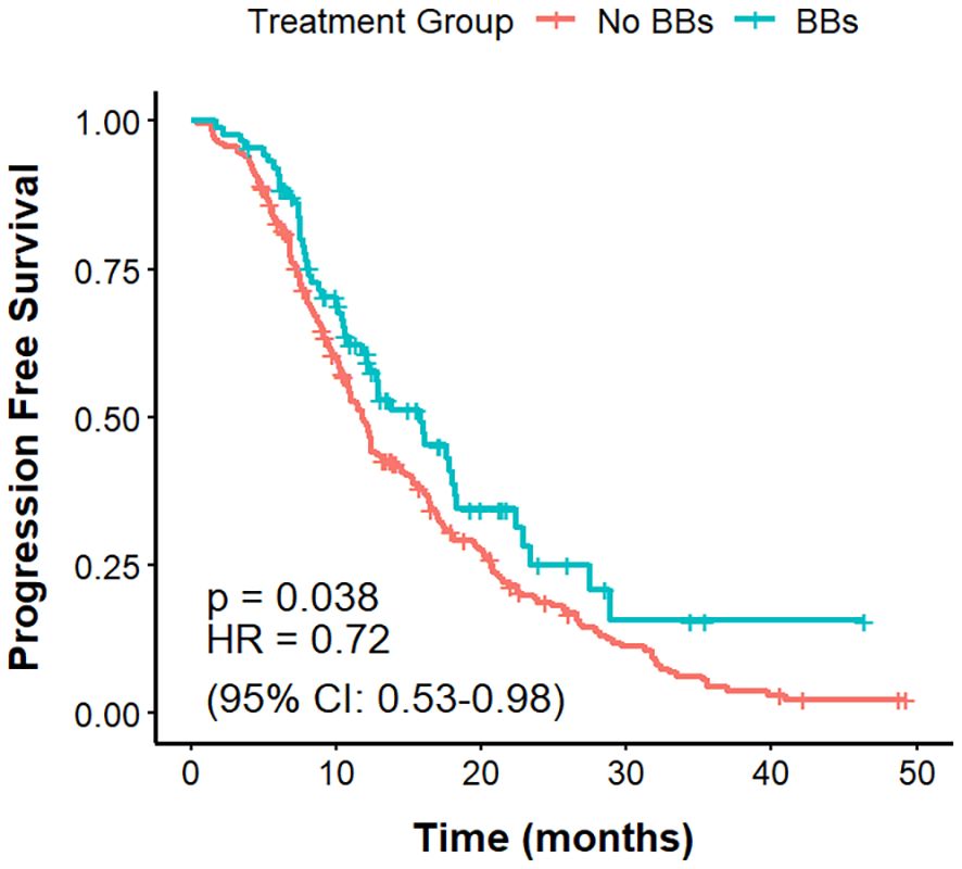 The mPFS was 11.8 months in the No BBs cohort and 15.8 months in the BBs cohort (Figure 2). The difference in PFS between the two groups was statistically significant (P = 0.038, HR = 0.72, 95% CI: 0.53–0.98).