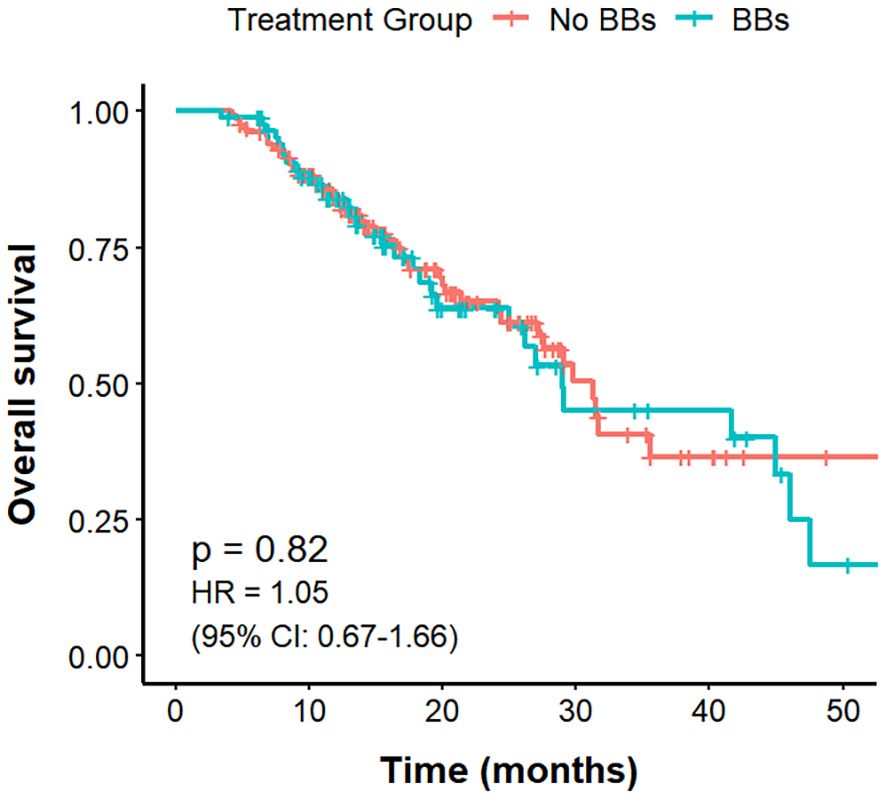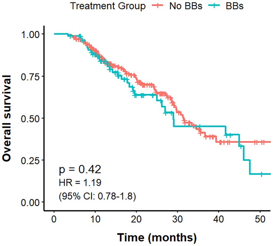 The mOS was 31.5 months in the No BBs cohort and 29.0 months in the BBs cohort, with no statistically significant difference between the groups (P = 0.43, HR = 1.19, 95% CI: 0.78–1.79; Figure 3).