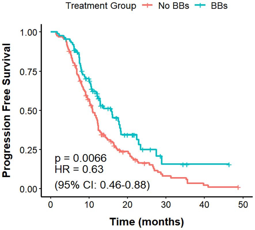 Results: After PSM, 318 patients were included (88 BBs, 230 No BBs). BBs use was associated with longer median PFS (mPFS) (15.8 vs. 11.8 months; HR = 0.67, 95% CI: 0.49–0.92, P = 0.038) and higher ORR (51.1% vs. 35.2%, P = 0.014), but not improved median OS (mOS) (29.0 vs. 31.5 months; HR = 1.38, 95% CI: 0.93–2.03, P = 0.108). BBs use independently predicted improved ORR (OR = 0.45, 95% CI: 0.26–0.78, P = 0.004) and longer PFS (HR = 0.67, 95% CI: 0.49–0.92, P = 0.014). In patients with cardiovascular comorbidities (CVD), BBs use was linked to longer mPFS (15.8 vs. 10.9 months, P = 0.0066) and higher ORR(51.1% vs 27.0%, P<0.001), with no mOS difference (P = 0.82). Among non-small cell lung cancer (NSCLC) patients, mPFS (17.5 vs. 12.3 months, P = 0.04) and ORR (56.0% vs 35.9%, P = 0.004) were also improved in the BBs group, whereas OS did not differ significantly (P = 0.3).