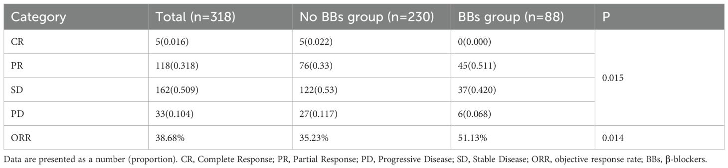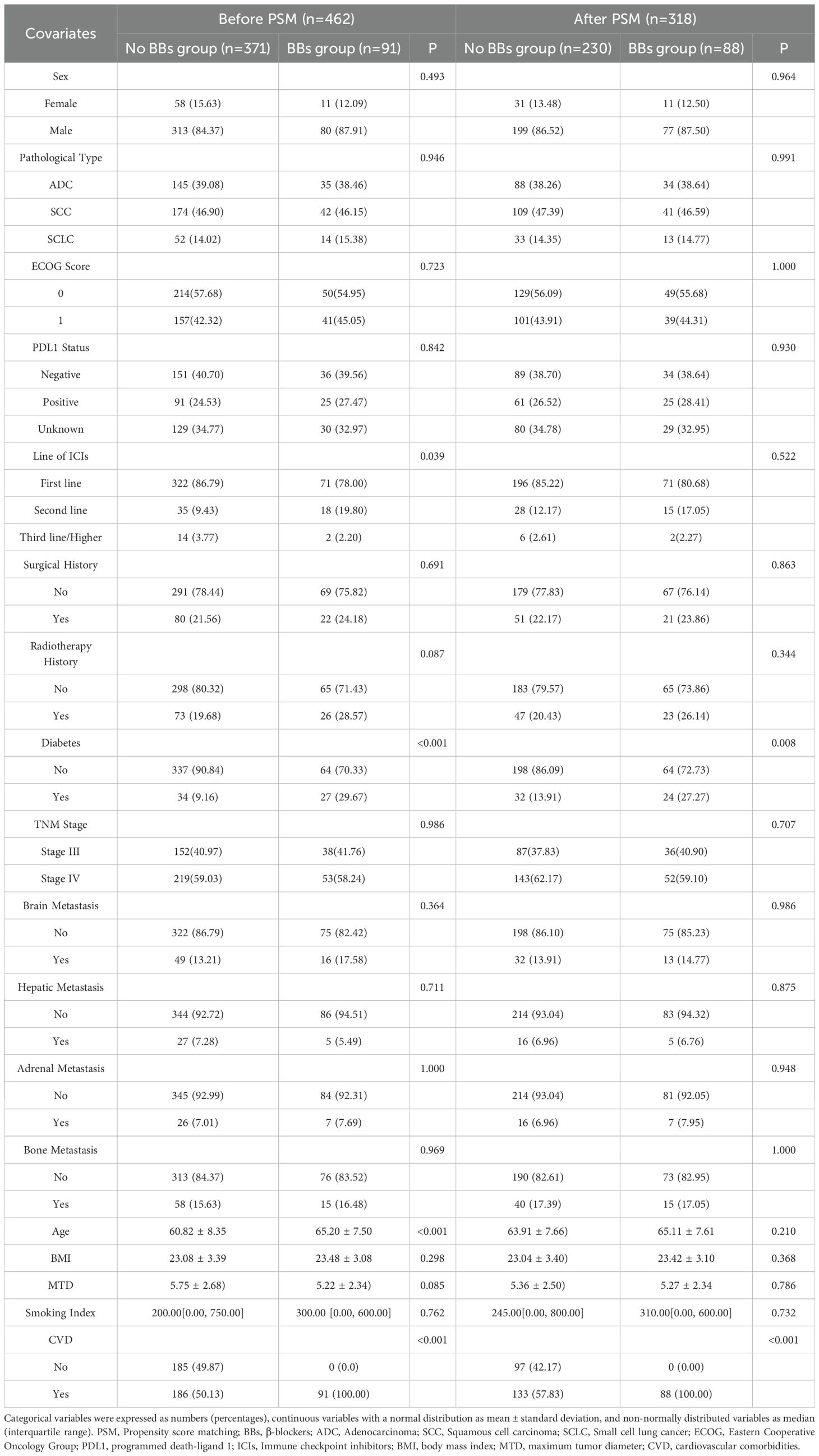 Our study is a multicenter retrospective analysis of 462 patients with advanced lung cancer from three hospitals. In the unmatched original cohort, the BBs group exhibited more unfavorable baseline characteristics, including older age, a higher prevalence of diabetes, and universal presence of underlying CVD, indicating a generally poorer health status and greater comorbidity burden. Furthermore, the BBs group had a lower proportion of patients receiving ICIs as first-line therapy, while previous studies have shown ICIs to be more effective in the first-line setting (35, 36). These factors may have introduced bias favoring the No BBs group. Therefore, to control for these potential confounding factors, PSM was performed, resulting in 230 patients in the No BBs group and 88 patients in the BBs group. After matching, baseline characteristics were comparable between the two groups except for differences in history of CVD (P < 0.001) and diabetes (P = 0.008). Notably, the imbalance in CVD stems from the clinical indications for BBs, which are primarily prescribed for hypertension, arrhythmia, heart failure, and other cardiovascular conditions (10). Thus, this imbalance reflects clinical practice realities rather than a methodological flaw. However, in subsequent multivariate Cox and logistic regression analyses, diabetes and CVD were not identified as independent prognostic factors for PFS, OS, or ORR, suggesting a limited impact of these differences on the primary outcomes.