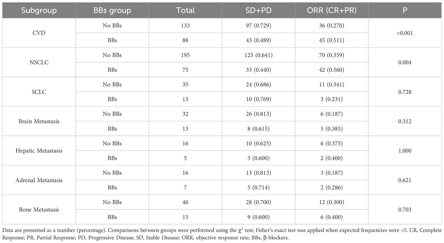 This study further explored the prognostic differences of BBs use among patients with varying clinical characteristics through subgroup analysis. Among lung cancer patients with comorbid CVD, BBs use was associated with prolonged mPFS (15.8 vs. 10.9 months; P = 0.0066) and an increased ORR (51.1% vs. 27.0%; P <0.001) relative to the No BBs group, while no difference was observed in OS. Within the No BBs group, patients with CVD had slightly lower ORR than those without CVD, but PFS and OS were comparable. Comparison between the BBs group and the No BBs + No CVD group revealed no significant differences in PFS, OS, or ORR. These findings suggest that some patients with CVD in the no BBs group may be receiving specific treatments that exclude beta-blockers, potentially reducing short-term efficacy. Meanwhile, BBs may influence tumor progression and mitigate CVD complications (17). Relevant preclinical studies indicate that chronic stress associated with CVD leads to sustained activation of adrenergic signaling, which reduces immune cell infiltration in the tumor microenvironment and suppresses antitumor immunity and tumor cell apoptosis (48, 49); and BBs can antagonize these processes. BBs may partly contribute to improved short-term efficacy in patients with CVD, but further studies are needed to confirm whether this reflects a true synergistic effect with ICIs or reduced efficacy in CVD patients not receiving BBs or other confounding variables.