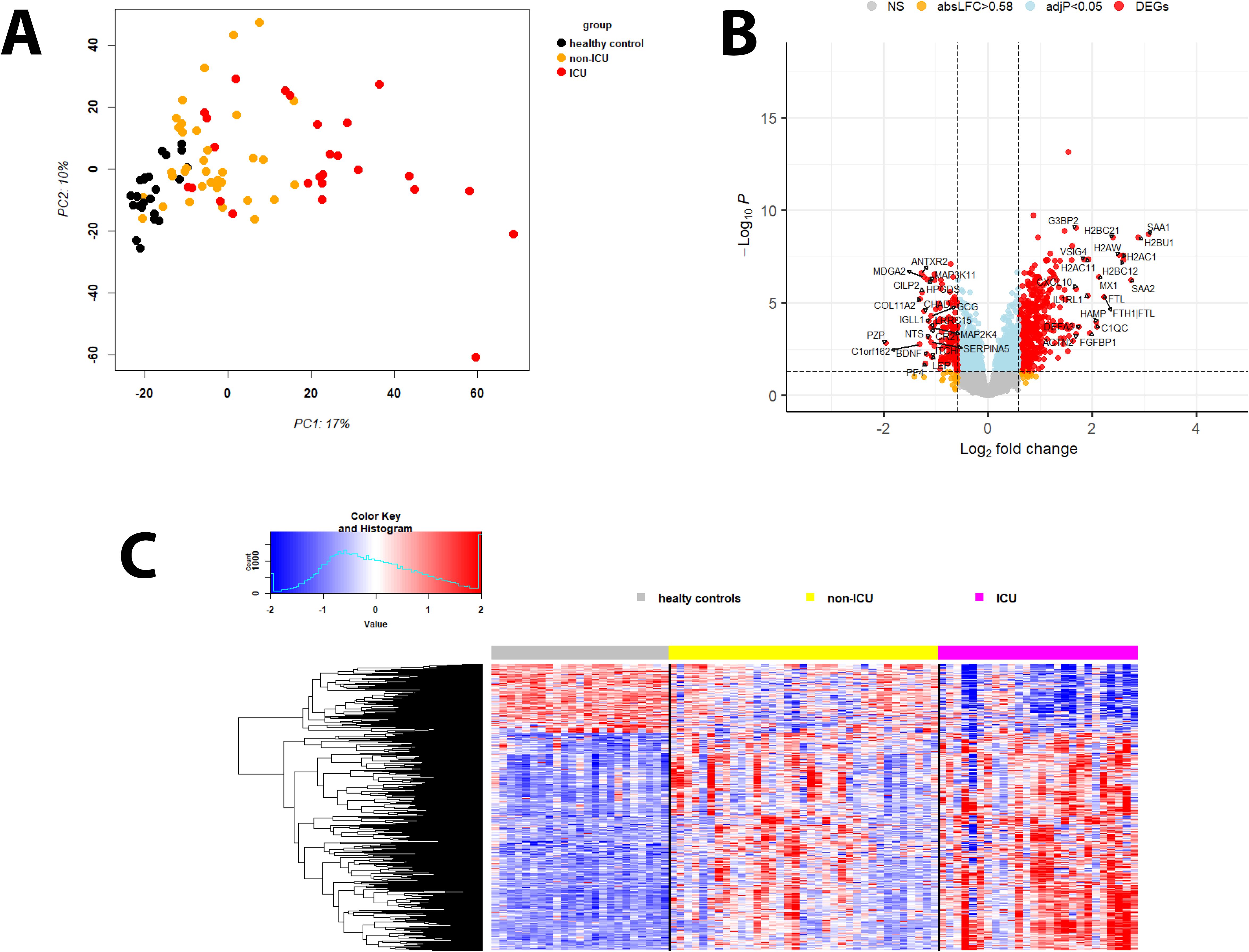 Figure 1. Principal component analysis and DEPs of infected versus healthy controls. (A) Principal Component Analysis (PCA) plot for protein expression values of healthy controls (black) and infected participants not in ICU (orange) and in ICU (red). (B) Volcano plot of DEPs for infected patients versus healthy controls. Y-axis: -log10 BH multiple testing adjusted P values, x-axis: log2 change. DEPs are colored red; the top 20 up- and downregulated (by log2 change) DEPs are labeled. Blue: not significant proteins with an adjusted P < 0.05. Orange: not significant proteins with an absolute log2 change > 1. (C) Heatmap of DEPs regulated in infected patients versus healthy controls for healthy controls (grey), patients not in ICU (yellow) and in ICU (magenta). Expression levels are scaled by row, red: higher relative levels, blue: lower relative expression levels.