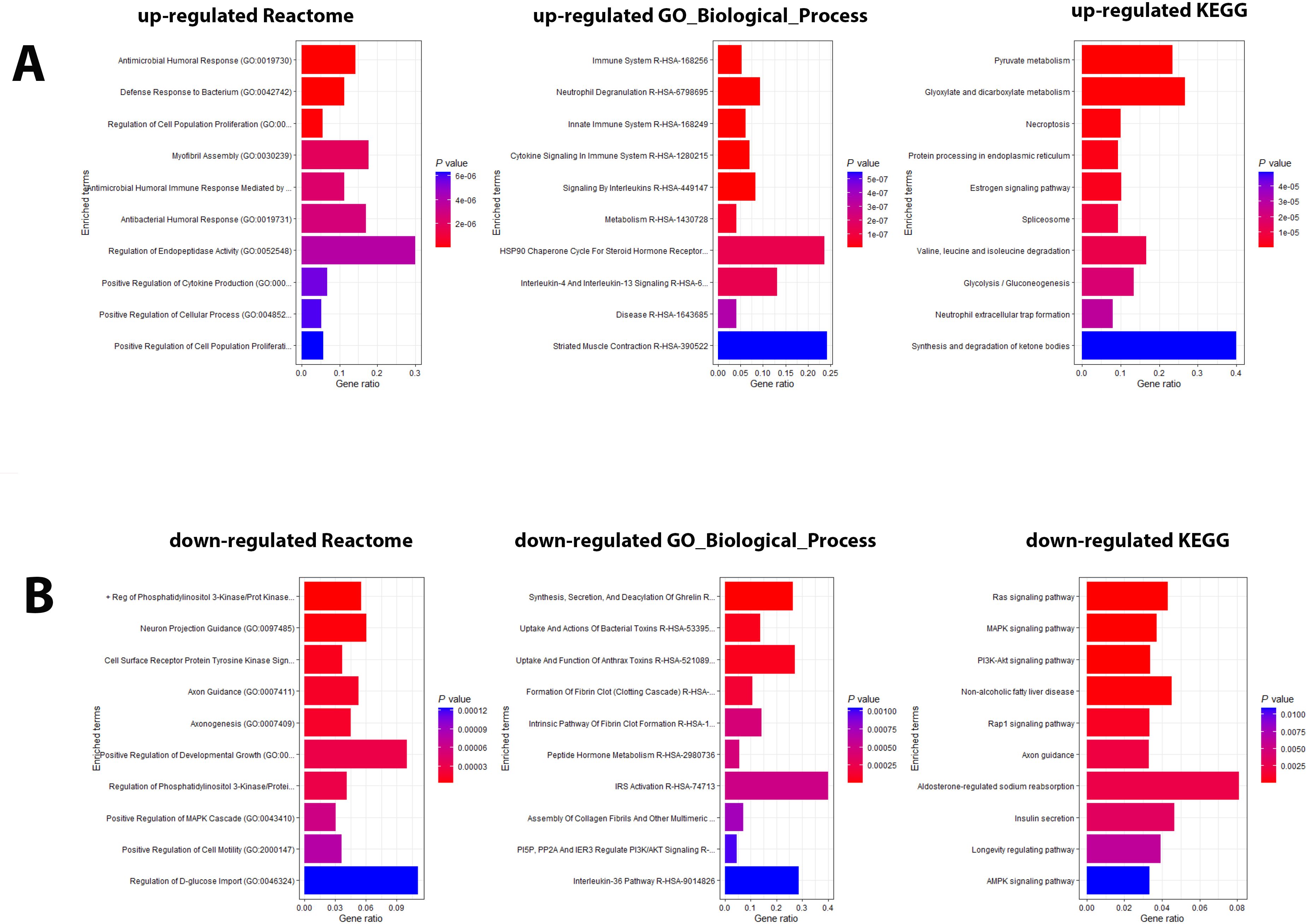 Figure 5. Pathway analysis of DEPs from the contrast of infected patients versus controls. (A) Functional analysis of up-regulated and (B) down-regulated DEPs from the contrast of ICU versus non-ICU patients. Bars represent the top 10 (by P value) pathway hits of EnrichR analysis (y-axis for gene ratios and color for P values) from databases "Reactome_2022", "GO_Biological_Process_2025", and "KEGG_2021_Human".
