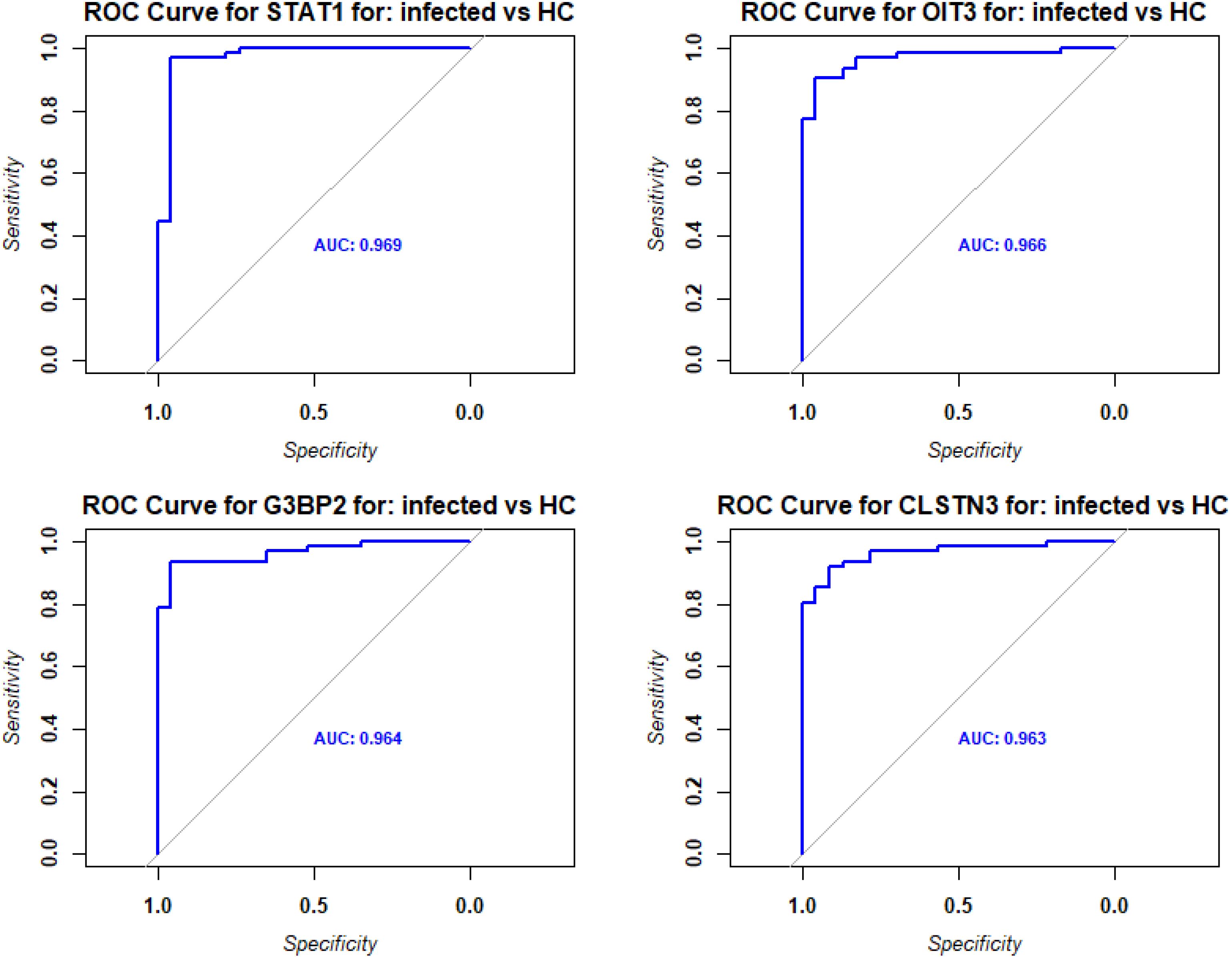 Figure 3. ROC analysis of DEPs from contrast of infected versus healthy controls. Receiver operating characteristic (ROC) curves (blue) for the top four DEPs with the highest predictive values (AUC: area under the curve).