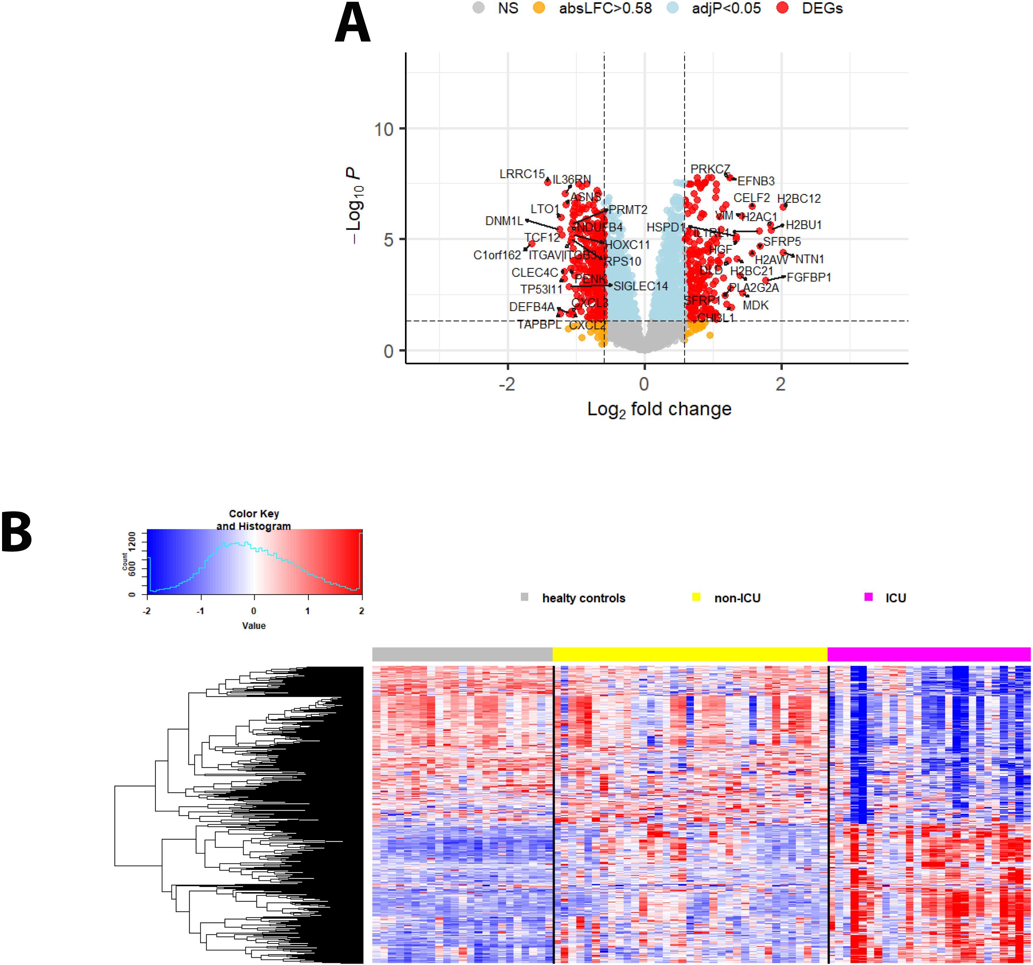 Figure 4. DEPs from the contrast of ICU versus non-ICU patients. (A) Volcano plot of DEPs for ICU versus non-ICU patients. ‘Upregulated’: higher in ICU, ‘downregulated’: higher in non-ICU patients. Y-axis: -log10 BH multiple testing adjusted P values, x-axis: log2 change. DEPs are colored red; the top 20 up- and downregulated (by log2 change) DEPs are labeled. Blue: not significant proteins with an adjusted P < 0.05. Orange: not significant proteins with an absolute log2 change > 1. (B) Heatmap of DEPs regulated in ICU versus non-ICU patients for healthy controls (grey), patients not in ICU (yellow) and in ICU (magenta). Expression levels are scaled by row, red: higher relative levels, blue: lower relative expression levels.