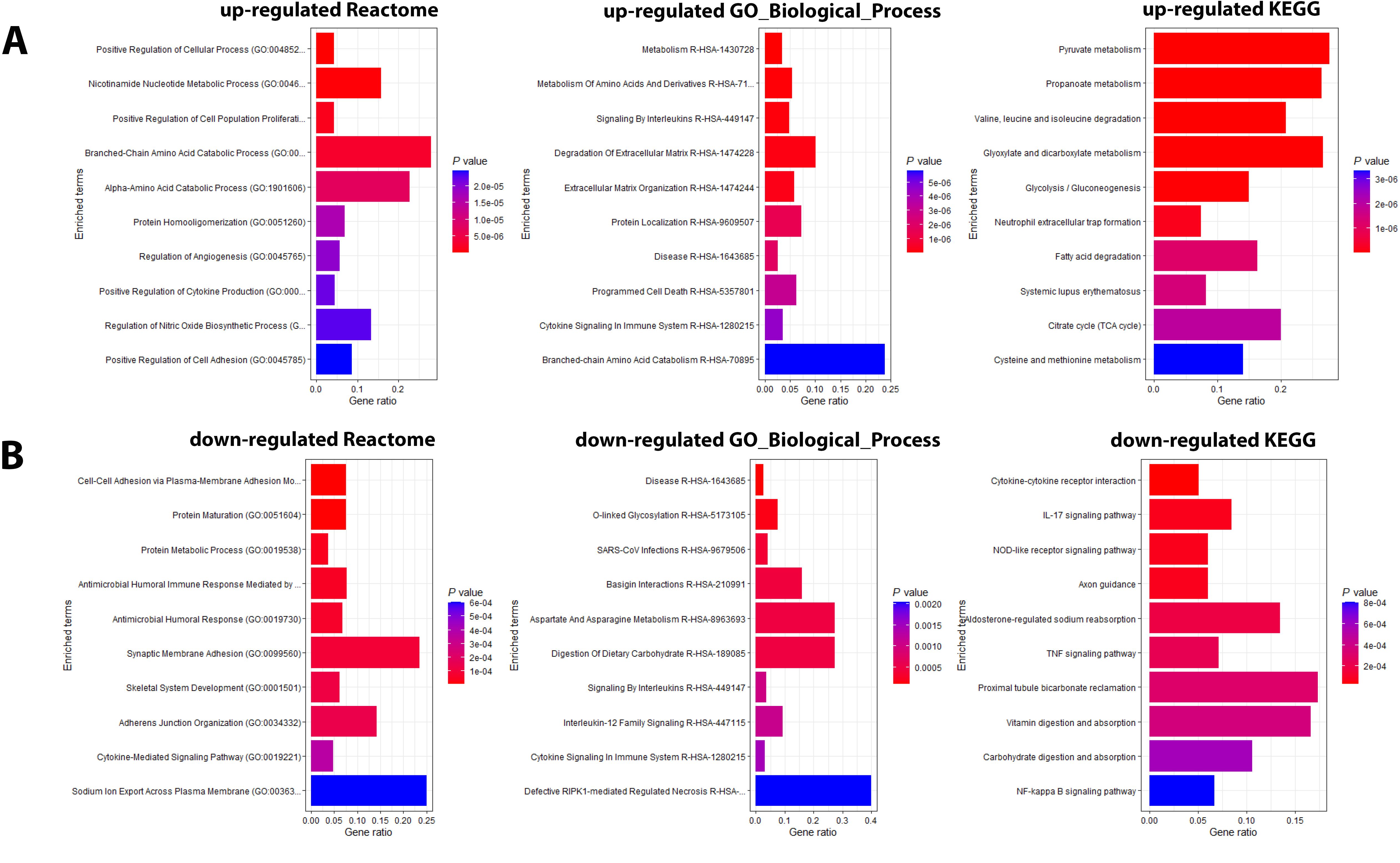 Figure 2. Pathway analysis of DEPs from the contrast of infected patients versus controls. (A) Functional analysis of up-regulated and (B) down-regulated DEPs from the contrast of infected patients versus healthy controls. Bars represent the top 10 (by P value) pathway hits of EnrichR analysis (Y-axis for gene ratios and color for P values) from databases "Reactome_2022", "GO_Biological_Process_2025", and "KEGG_2021_Human".