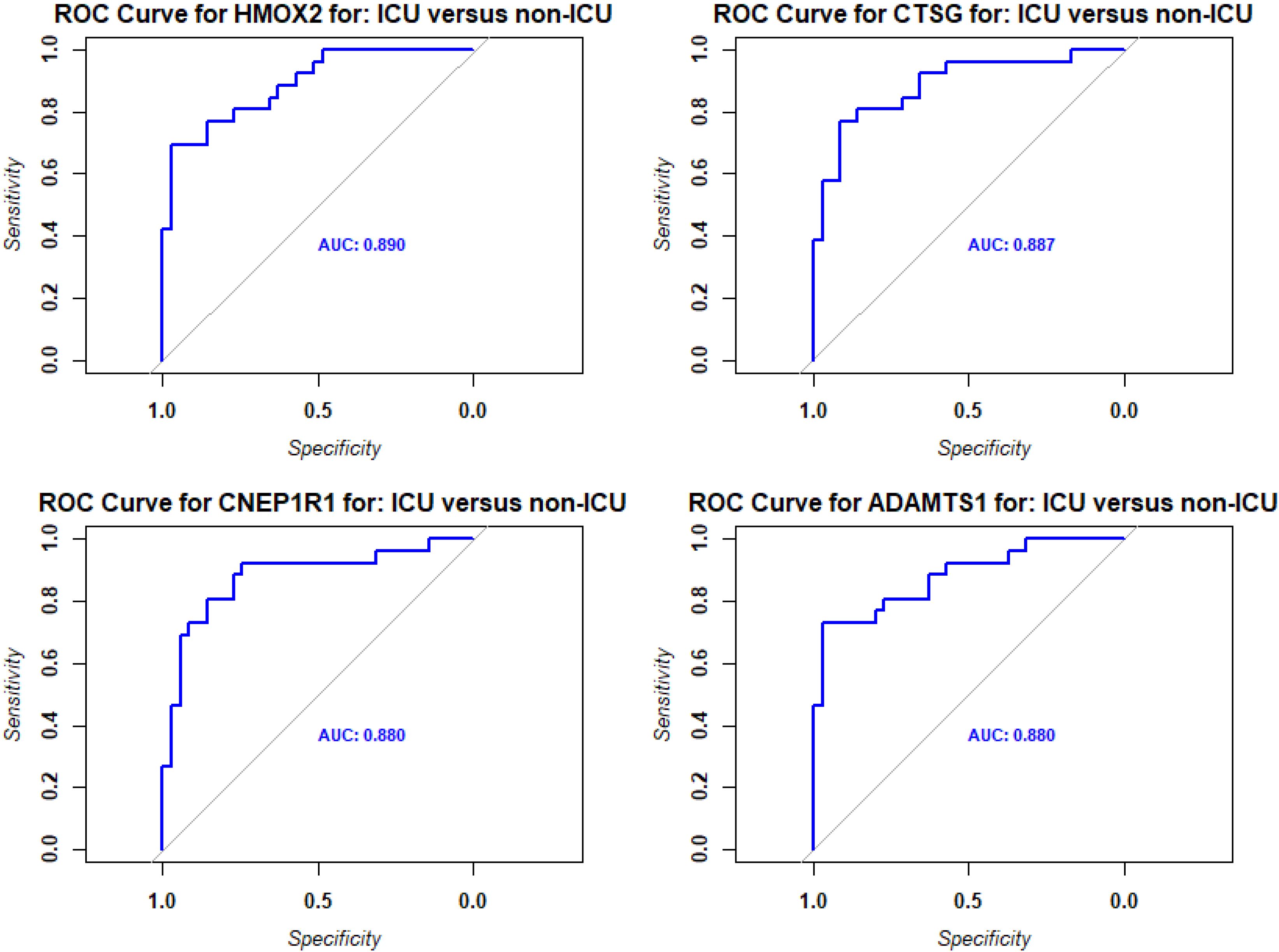 Figure 6. ROC analysis of DEPs from contrast of ICU versus non-ICU patients. Receiver operating characteristic (ROC) curves (blue) for the top four DEPs with the highest predictive values (AUC: area under the curve).