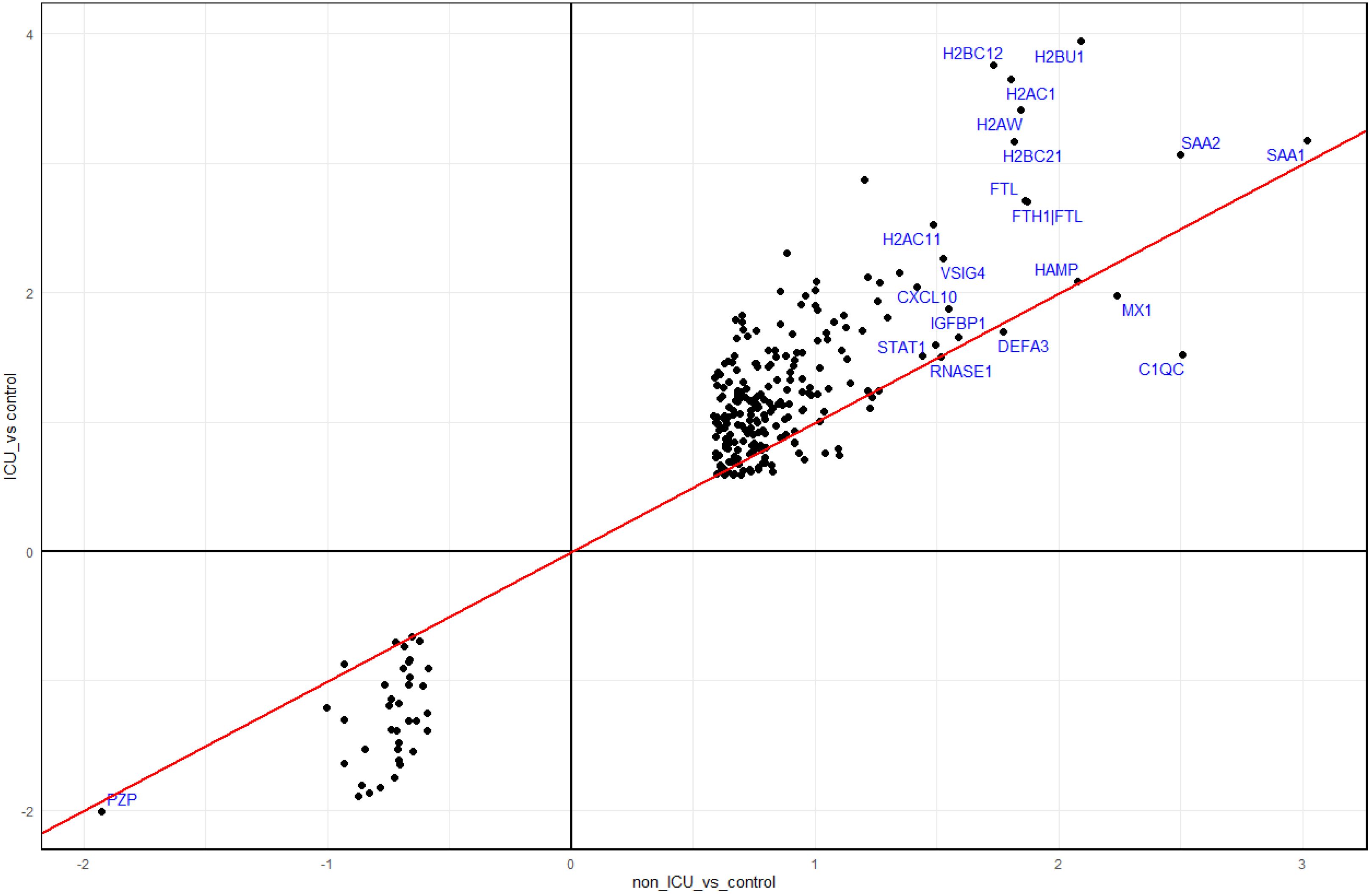 Figure 7. Comparison of DEPs from ICU and non-ICU patients versus controls. Scatter plot of DEPs from contrasts of ICU patients versus healthy controls and non-ICU patients versus healthy controls. Dots represent log2 differences of ICU versus controls (Y-axis) and non-ICU versus controls (x-axis). The top 20 proteins (by absolute expression levels in non-ICU) are labeled blue.