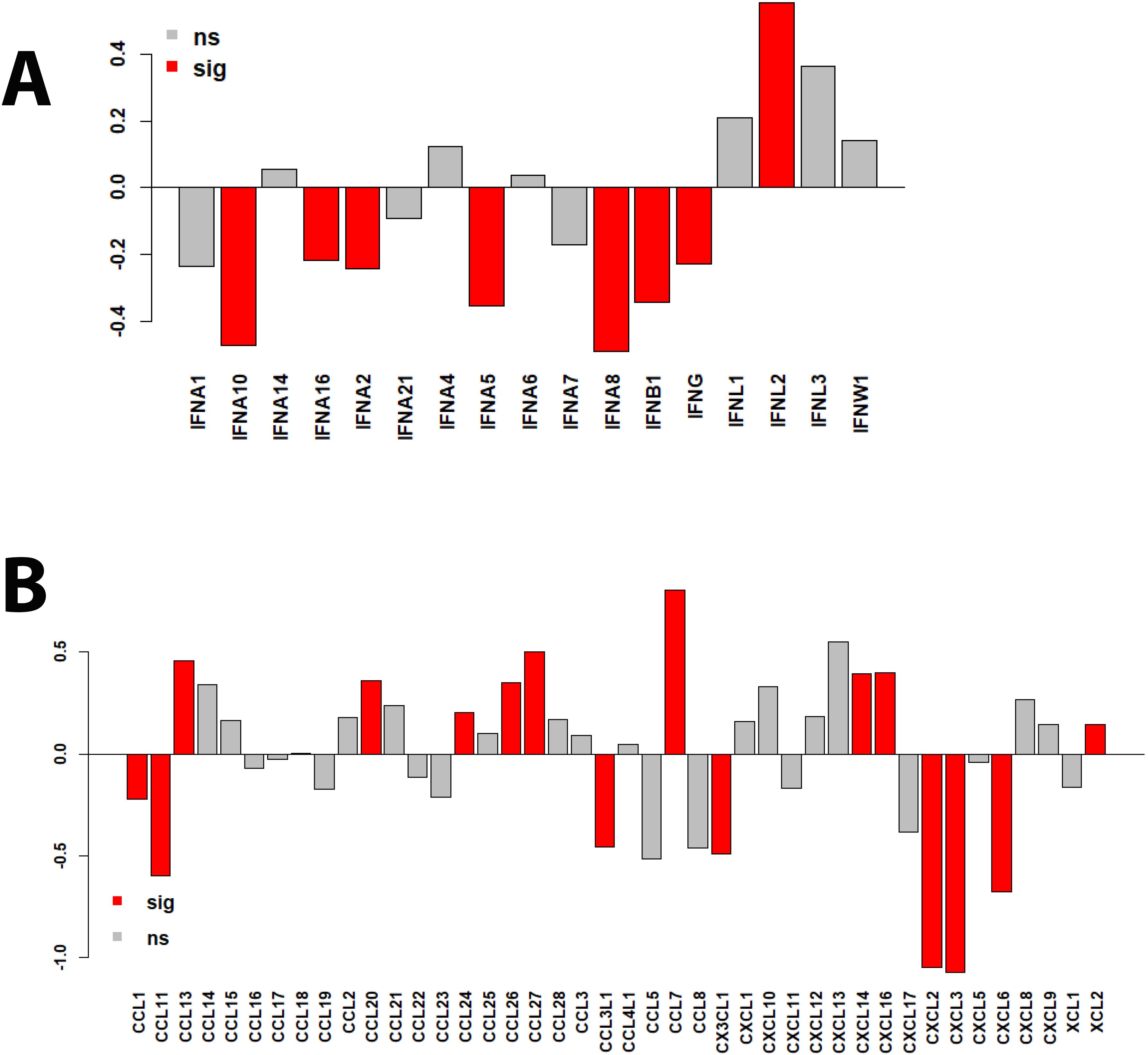 Figure 8. Bar plots of protein expression levels in ICU versus non-ICU patients. (A) Bar plots representing differences in log2 changes for ICU versus non-ICU patients for interferon proteins. (B) Bar plots representing differences in log2 changes for ICU versus non-ICU patients for chemokine and cytokine proteins. sig (red): DEPs that were significantly different (multiple testing BH-adjusted P values) in the contrast of ICU versus non-ICU patients. ns: not significant (grey).