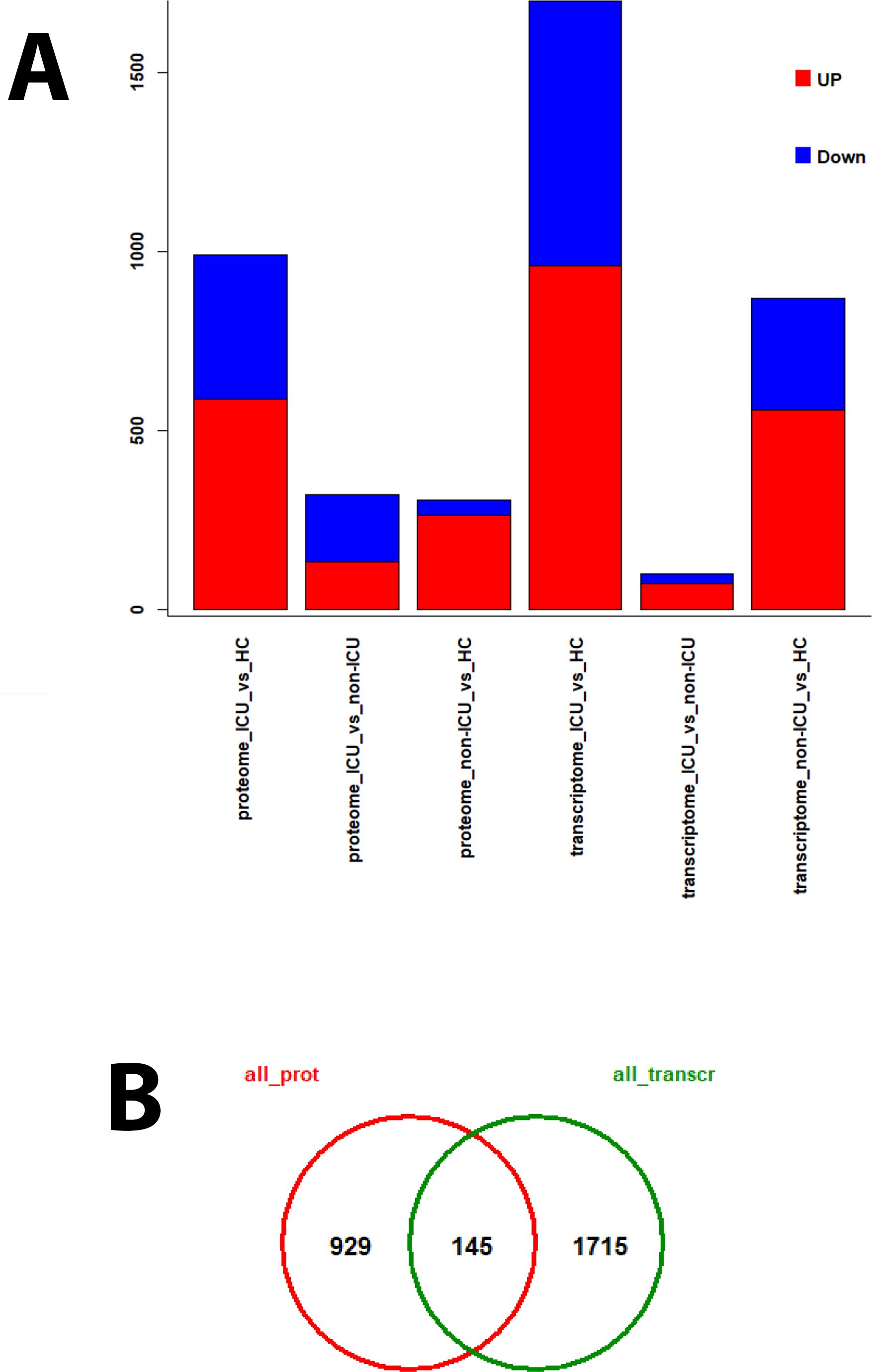 Figure 9. DEPs and DEGs for proteomes and transcriptomes from different contrasts. For patients from whom both transcriptome and proteome data were available, various contrasts for the identification of DEPs and DEGs were performed. (A) Bar plot representing the numbers of up- (red) and down-regulated (blue) DEPs and DEGs for the individual contrasts. (B) Venn diagram of overlapping DEPs (all_prot) and DEGs (all_transcr) using results from all contrasts.