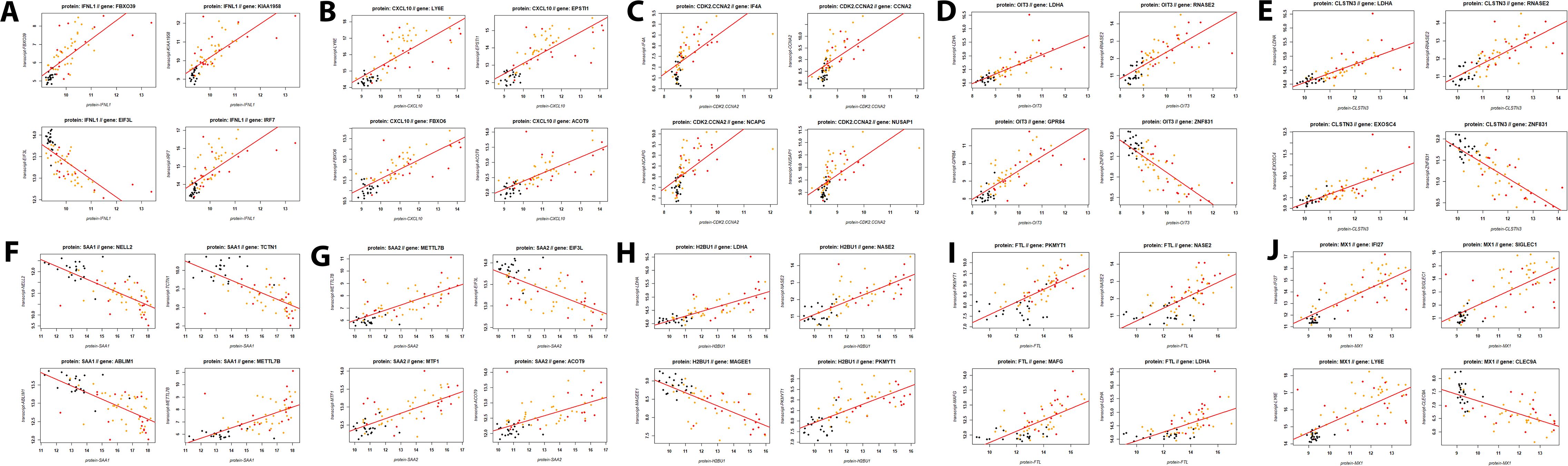 Figure 10. Scatter plots for proteins and their corresponding top four most strongly correlated DEGs. (A) IFNL1, (B) CXCL10, (C) CDK2 / CCNA2, (D) OIT3, (E) CLSTN3, (F) SAA1, (G) SAA2, (H) H2BU1, (I) FTL, and (J) MX1 proteins respectively, and their top four correlated genes. Dots represent transcriptome expression levels (Y-axis) and proteome expression levels (X-axis). Black: healthy controls, orange: non-ICU, and red: ICU cases.