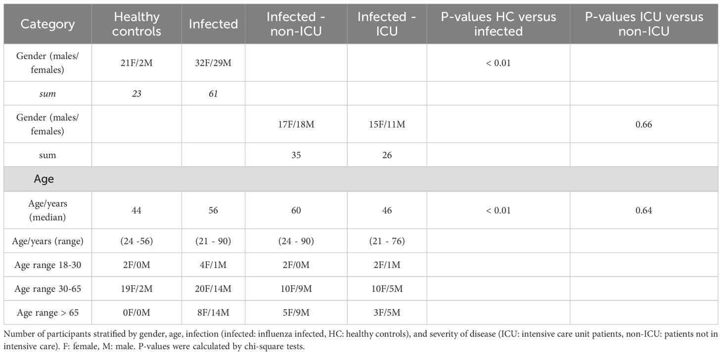 The patient cohort used for the analyses was described earlier (7). Briefly, patients with influenza infections and healthy controls were collected at five different sites. The total number of participants was 208, 81 were healthy controls, and 127 were influenza-infected patients, of whom 23 were admitted to the ICU. Healthy patients represented visitors to the hospital who volunteered to donate blood to our study. Samples from non-ICU infected patients were taken on the day of admission and were considered to have moderate disease. Samples from ICU patients were taken during their ICU stay (no specific time point). Additional six samples from ICU patients were taken at subsequent times during their stay. We selected a subgroup of 84 individuals that included 23 healthy controls and 61 influenza-infected patients. From three sites (Baptist Memorial Hospital (Memphis, TN USA), Otto-von-Gericke University (Magdeburg, Germany), University of North Carolina (Chapel Hill, NC USA). The selection of this subgroup was done manually to ensure equal representations for all groups where possible and to adhere to funding restrictions. Of the patients who reported to the hospitals with influenza, 26 were admitted to the ICU (Table 1). The number of females and males differed within groups. There were 21 females and 2 males in the healthy group (Table 1). In the influenza-infected groups, there were 32 females, 15 of whom were admitted to the ICU, and 29 males, 11 of whom were admitted to the ICU. The median age of the healthy controls was 44 years while the median age of the infected patients was 56 years (non-ICU: 60 years; ICU 46 years; Table 1). The full details of patient recruitment of the cohort have been described elsewhere (7).