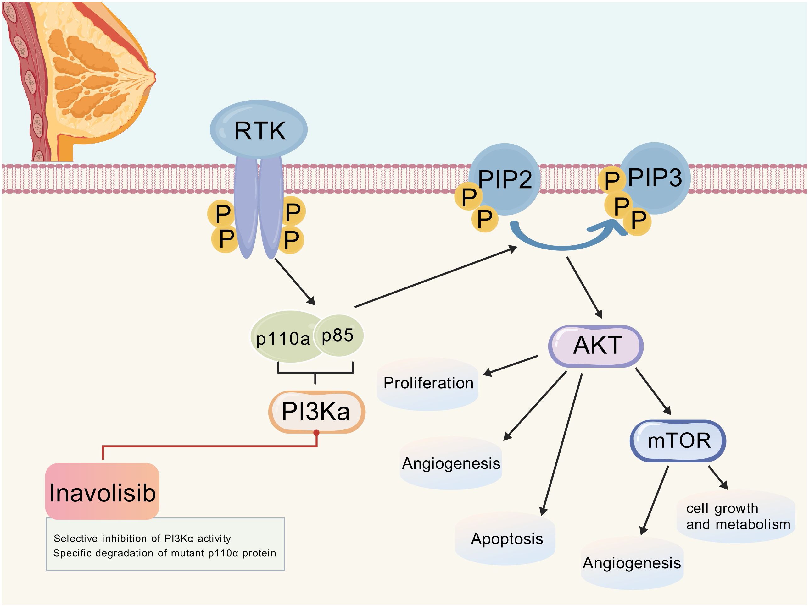 Figure 1. PI3K/AKT/mTOR signaling pathway and the mechanism of action of inavolisib. (Created with BioGDP.com). After RTK activation, PI3Kα is recruited and activated, which converts PIP2 to PIP3. PIP3 then activates AKT, which in turn regulates downstream molecules such as mTOR, affecting cell proliferation, angiogenesis, apoptosis, and cellular growth and metabolism. Inavolisib selectively inhibits PI3Kα activity and can also specifically degrade mutant p110α protein, thereby interfering with the abnormal activation of this pathway. RTK, Receptor tyrosine kinase; PI3Kα, Phosphatidylinositol-3 kinase α; PIP2, Phosphatidylinositol-4,5-bisphosphate; PIP3, Phosphatidylinositol-3,4,5-trisphosphate; AKT, Protein kinase B; mTOR, Mammalian target of rapamycin.