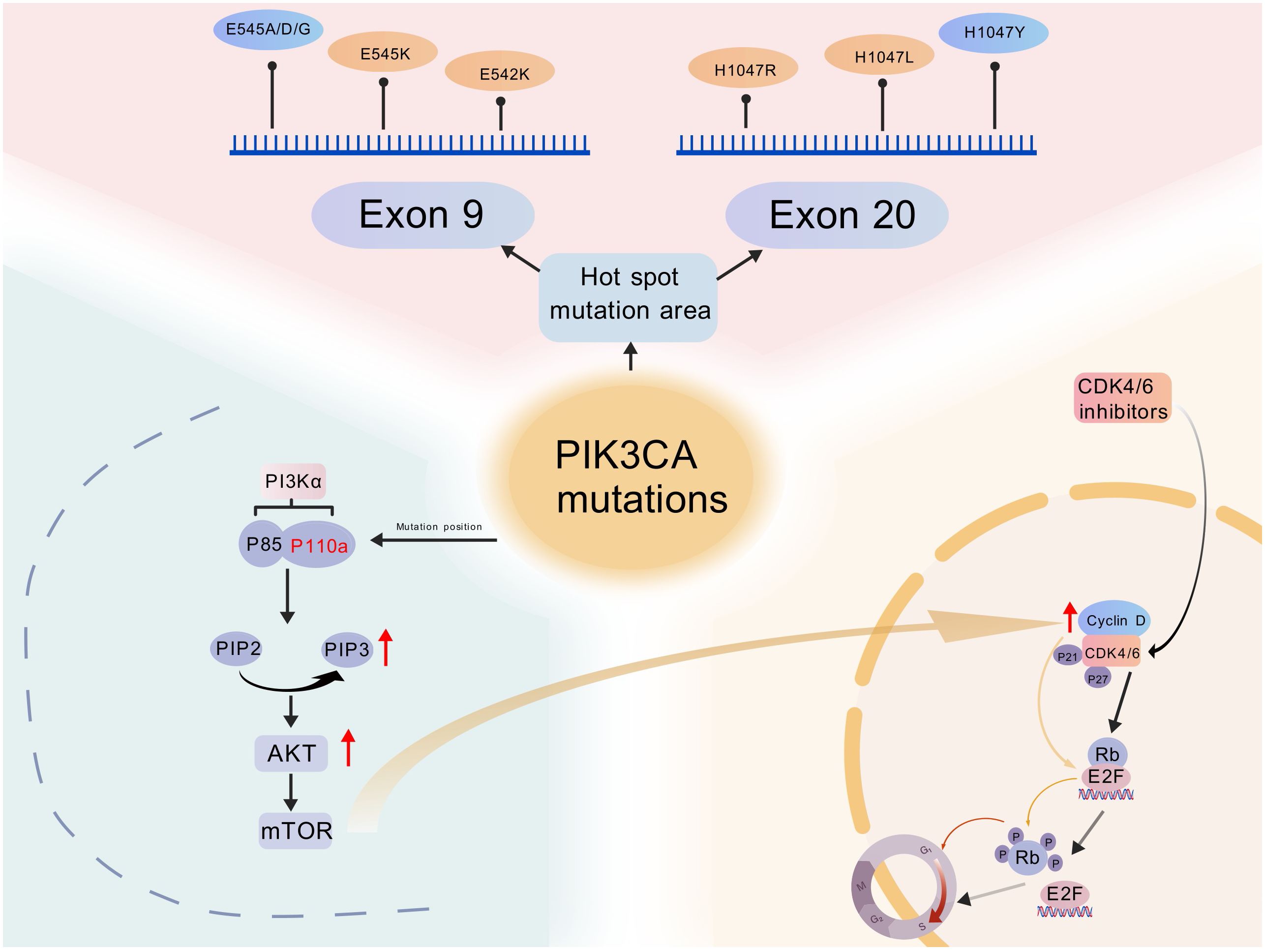 Increasing evidence suggests that abnormal activation of the PI3Kα pathway, particularly mutations in the PIK3CA gene encoding the catalytic subunit of PI3Kα, is one of the key mechanisms mediating resistance to CDK4/6 inhibitors. PIK3CA mutations are frequently observed in various solid tumors. compensatory activation of CDK2/Cyclin E or mitogenic pathways (e.g., RAS/RAF/MEK/ERK) that restore Sphase entry despite CDK4/6 inhibition (30–35) (Figure 2).