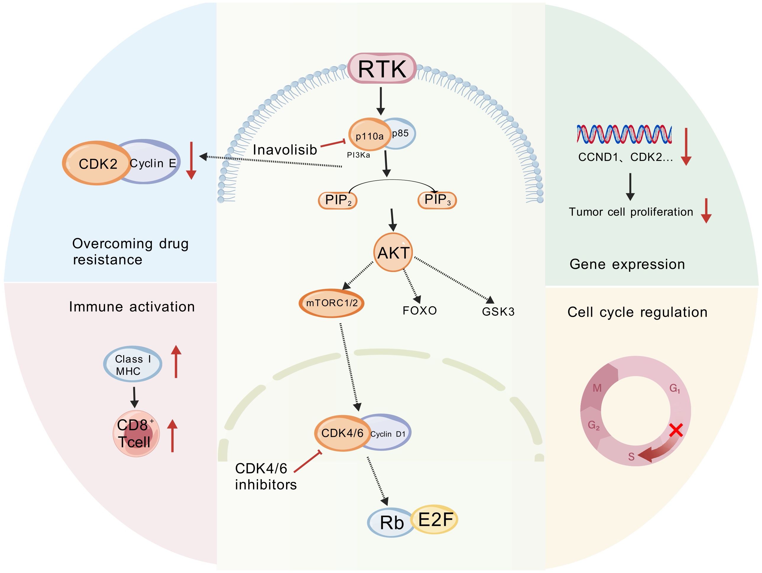 Combined inavolisib and CDK4/6 inhibition targets complementary tumor vulnerabilities—sustained PI3K signaling and aberrant cell-cycle progression—thereby addressing key resistance nodes and modulating the tumor microenvironment (Figure 3). Below, we summarize mechanistic evidence for synergy at signaling, cell-cycle, metabolic, and immune levels.