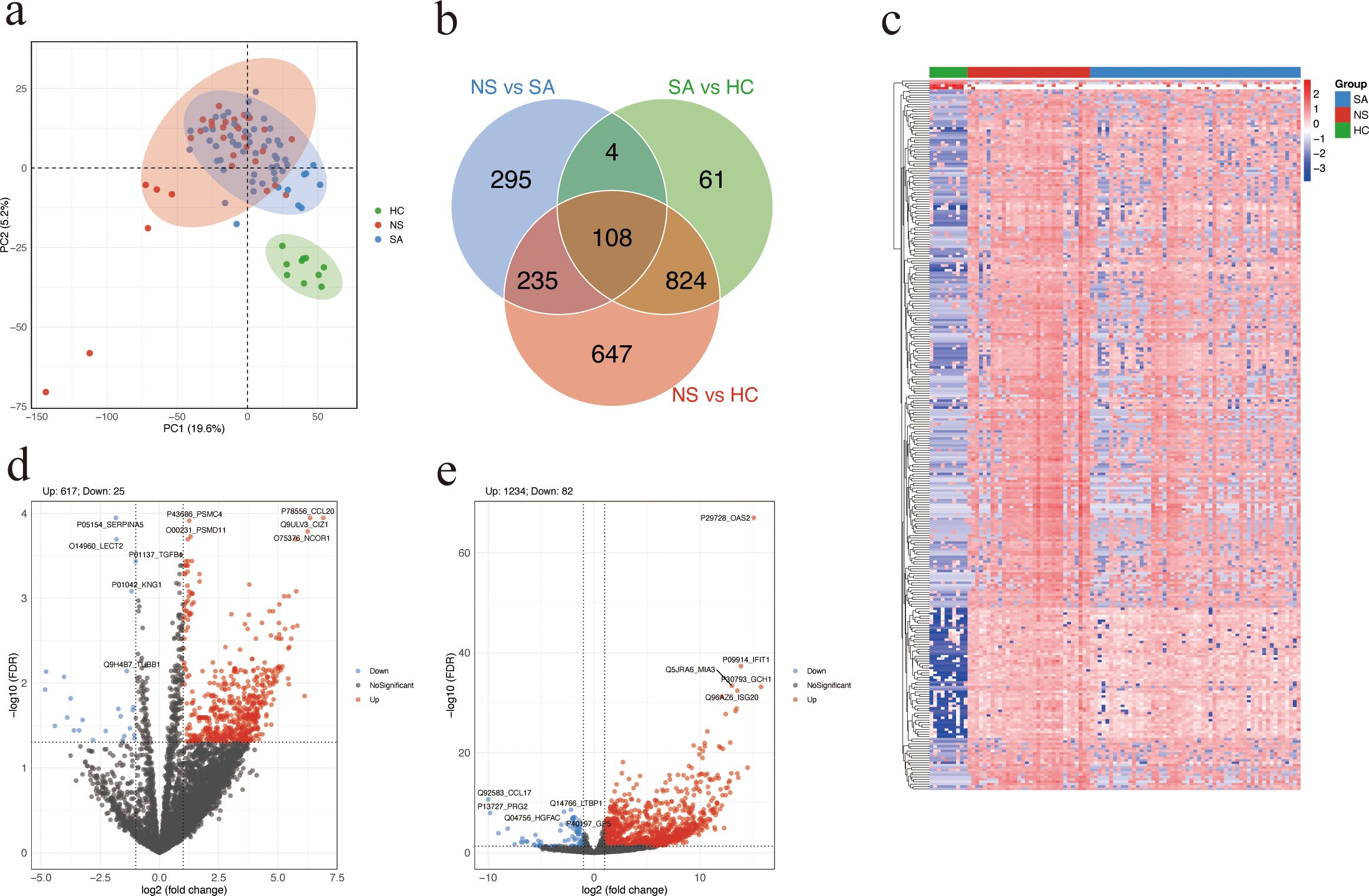 Figure 1. Differential protein abundance analysis. (a) Principal component analysis (PCA) plot of SA, NS, and HC based on proteomic profiles. Each dot represents a serum sample. (b) Venn diagram showing the overlap of DAPs among the three comparisons: NS vs SA, SA vs HC, and NS vs HC. (c) Heatmap showing the top 300 DAPs across the three groups. Higher and lower relative abundance levels are indicated in red and blue, respectively. (d, e) Volcano plot showing significant DAPs between NS and SA (d) or patients with SFTS and HC (e). Red and blue dots represent significantly upregulated and downregulated proteins, respectively; the top five of each are labeled. Proteins with FDR (Benjamini-Hochberg adjusted) < 0.05 and absolute log2 (fold change) > 1 were considered significantly differentially. SA, survivors. NS, non-survivors. HC, healthy controls. DAPs, differentially abundant proteins.