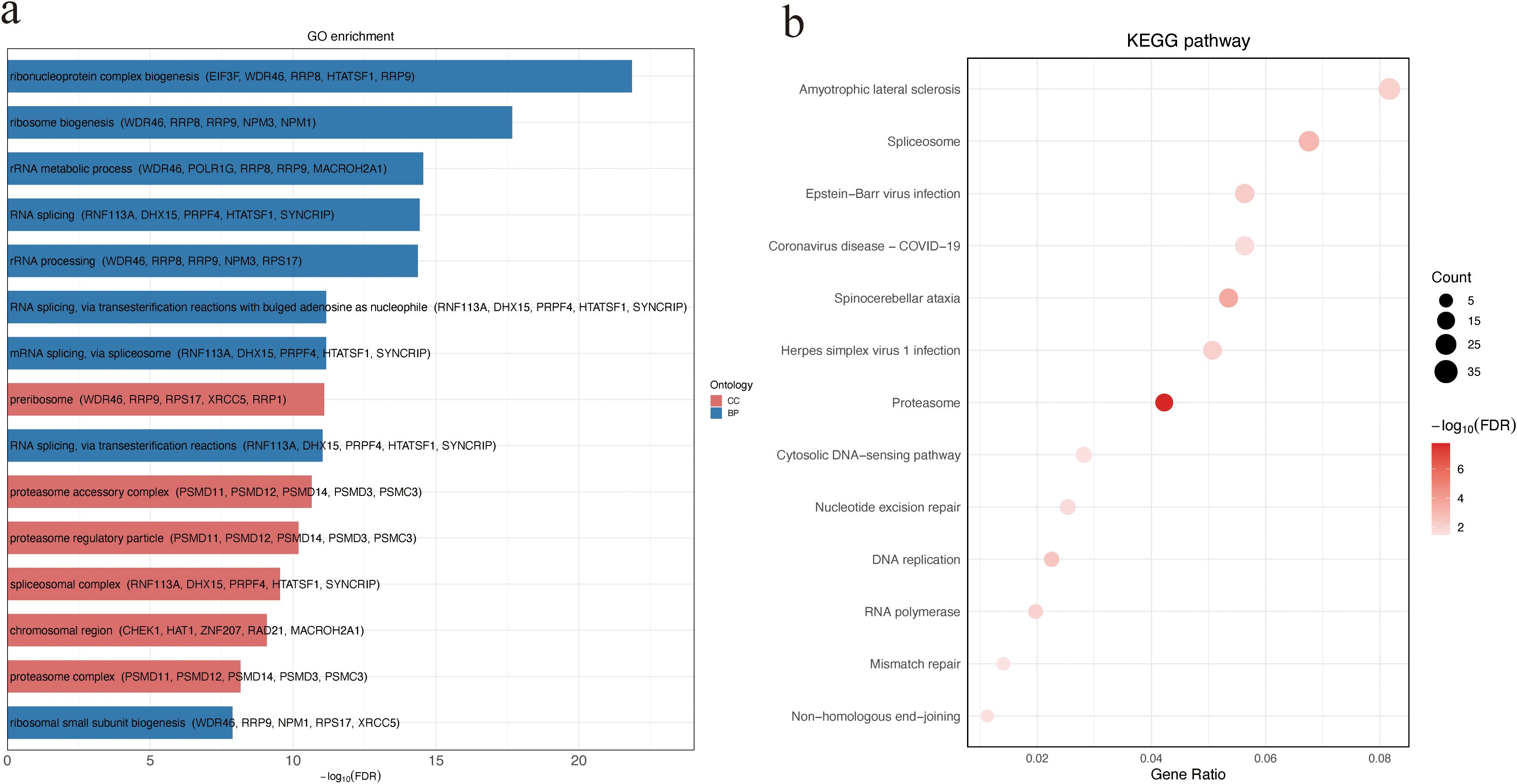 Graph showing two data visualizations. Panel (a) titled “GO enrichment” is a horizontal bar chart showing enrichment categories like ribonucleoprotein complex biogenesis and ribosome biogenesis with ontology classifications. Panel (b), titled “KEGG pathway”, is a dot plot showing pathways like amyotrophic lateral sclerosis and spliceosome, with dot size representing count and color indicating the negative logarithm of false discovery rate.