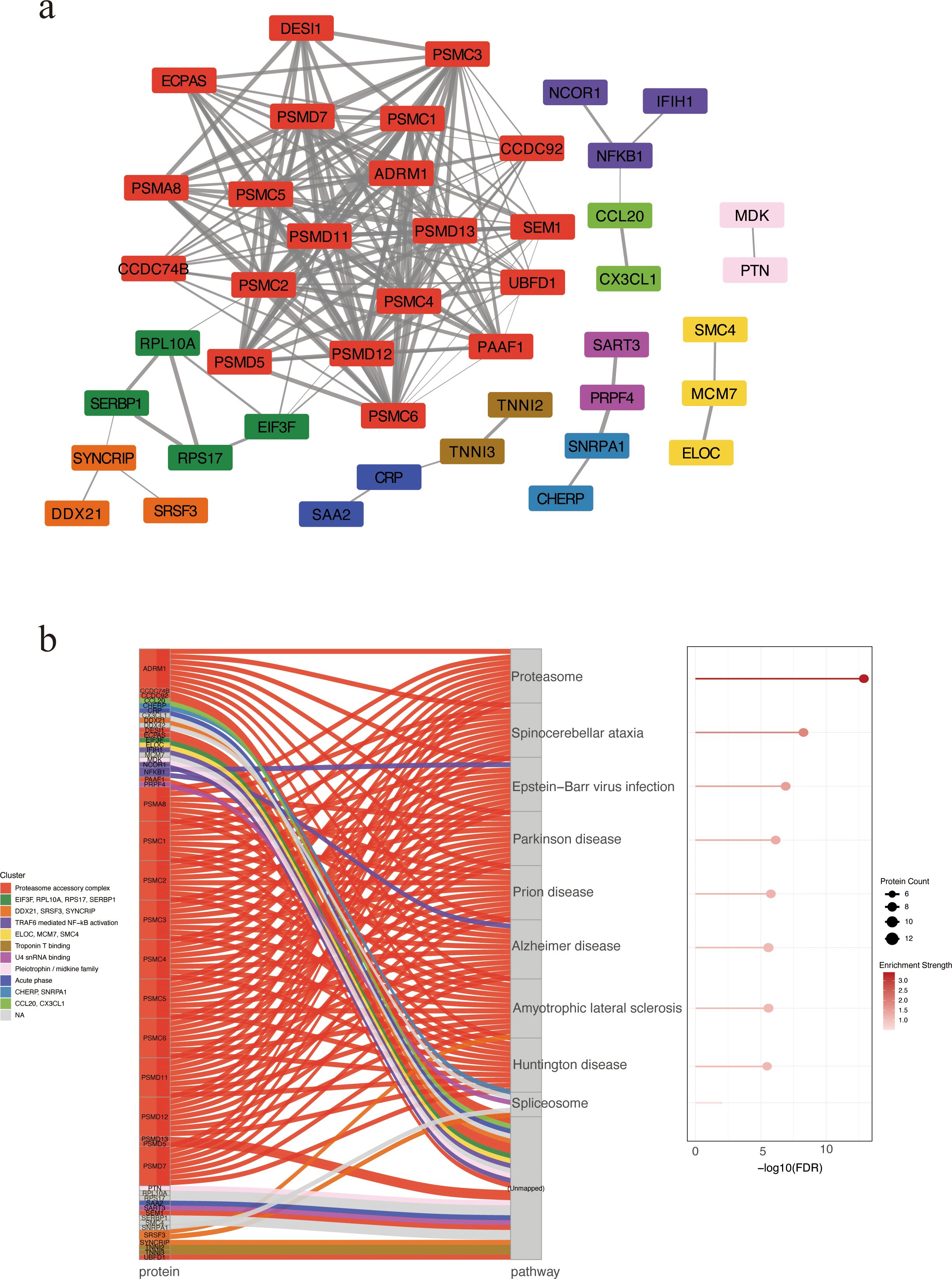 Panel a shows a network diagram with nodes representing proteins connected by lines, color-coded by protein complexes or clusters. Panel b displays a Sankey diagram linking proteins to pathways, with accompanying bar graph indicating protein count and enrichment strength for various diseases and molecular functions.