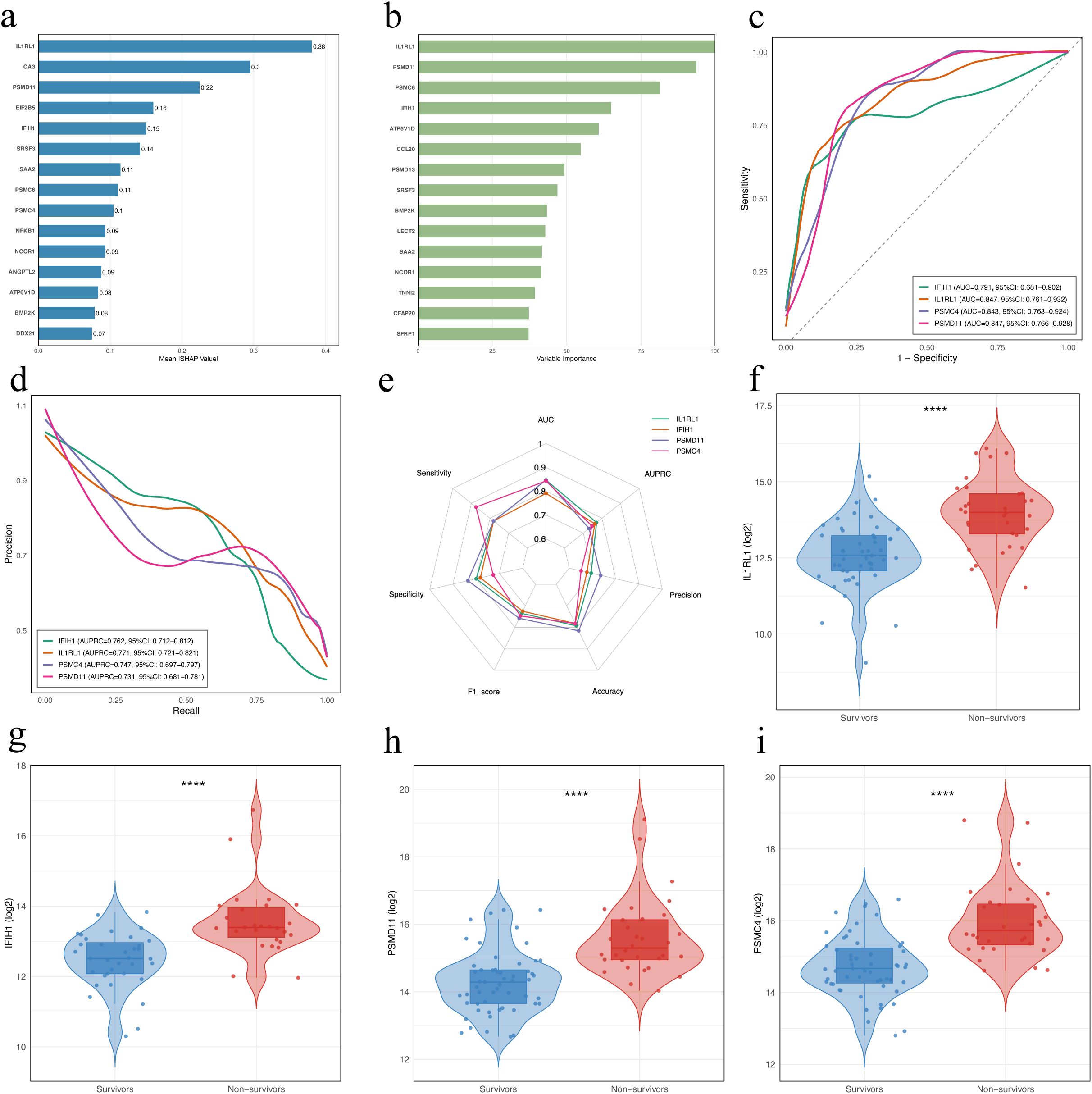 Figure 4. Identification and evaluation of potential prognostic biomarkers in patients with SFTS using machine learning. (a) Feature importance of DAPs in the XGBoost model. Bars indicate the mean absolute SHAP values averaged over 10-fold cross-validation. (b) Variable importance of proteins ranked by the Random Forest model. Variable importance scores were derived from a Random Forest classifier trained with 10-fold cross-validation, using DAPs (|log2FC| > 1, FDR < 0.05) as input features. (c) ROC curves for the four proteins. (d) Precision-recall (PR) curves for the four proteins. (e) Radar chart comparing diagnostic performance metrics of the four proteins. (f–i) Violin and box plots showing abundance levels of IL1RL1, IFIH1, PSMC4, and PSMD11 in survivors vs. non-survivors. Statistical significance was assessed using the Wilcoxon rank-sum test; **** indicates p < 0.0001. DAPs, differentially abundant proteins.